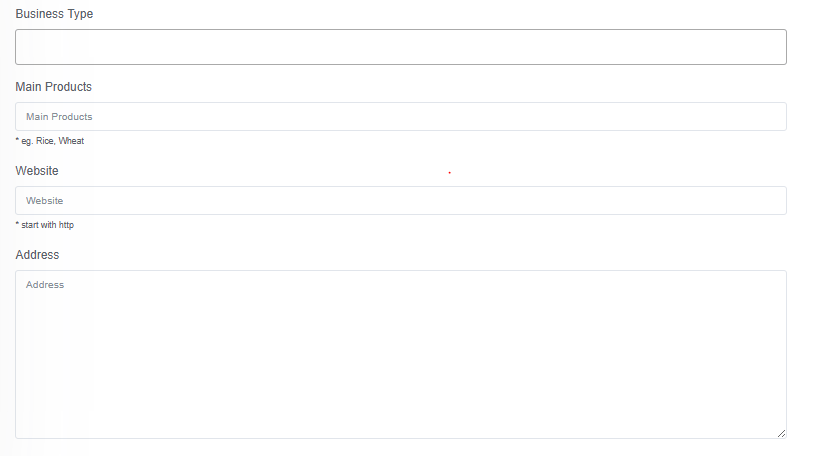 Fill in the following details, such as business type, main products, your website link, and the address of your company.