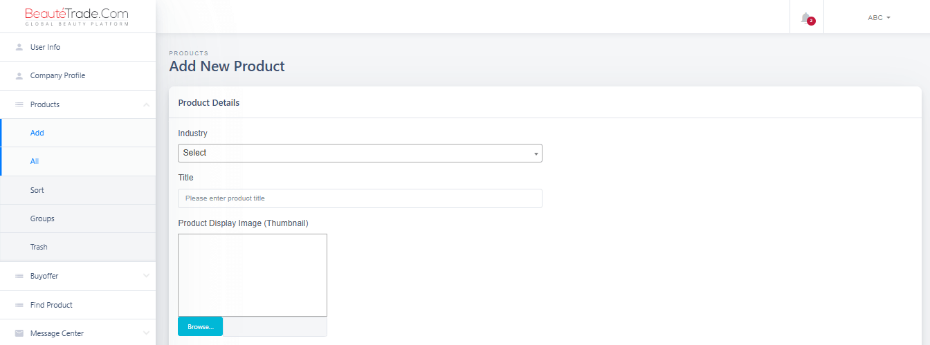 Industry: Click the dropdown box labeled "Select" to choose the relevant industry for your product (e.g., cosmetics, haircare, skincare, etc.).