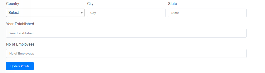 Selecting your country is mandatory. Fill in all the sections, such as city, state, year your company was established, and number of employees.