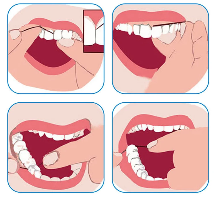 1. Break off approximately 18 inches of floss and wind it around your two pointer fingers (or middle fingers)2. Slide the floss gently up and down between your teeth3. Curve the floss in a “C” shape around each tooth, and be sure to go below your gum line. Be gentle and don’t forceit,though,because that can damage your gums and cause bleeding. You may experience some bleeding in the gums.4. Don't forget to go between each tooth, especially back teeth.