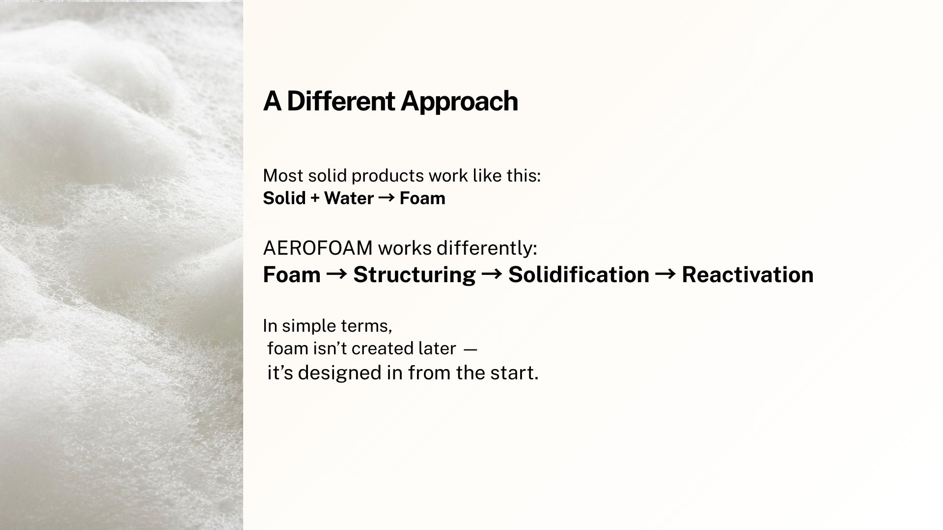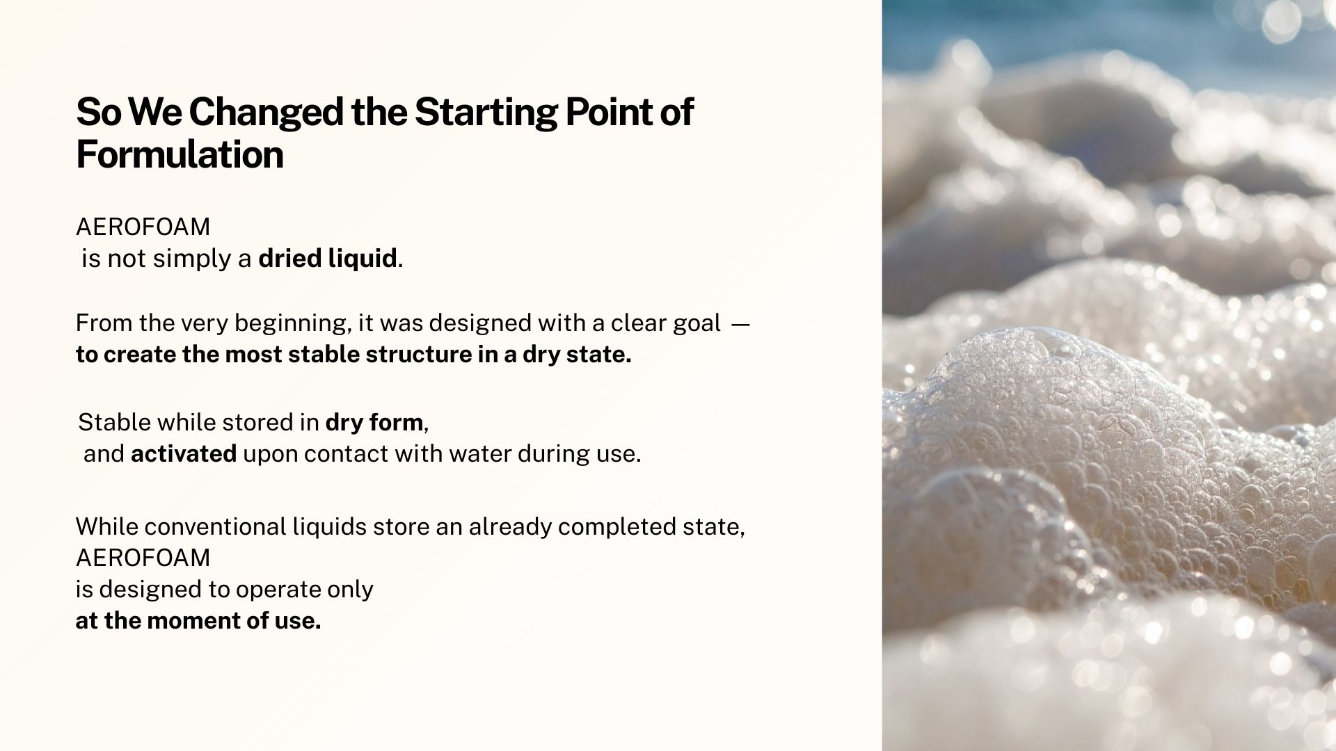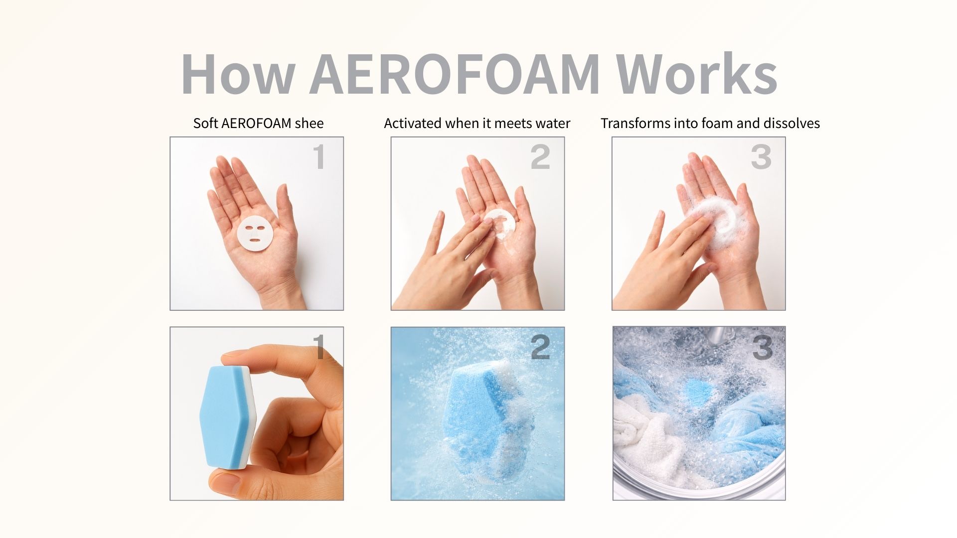 AEROFOAM addresses these limitations by storing the formulation in a stable dry structure that activates only when it comes into contact with water during use.
