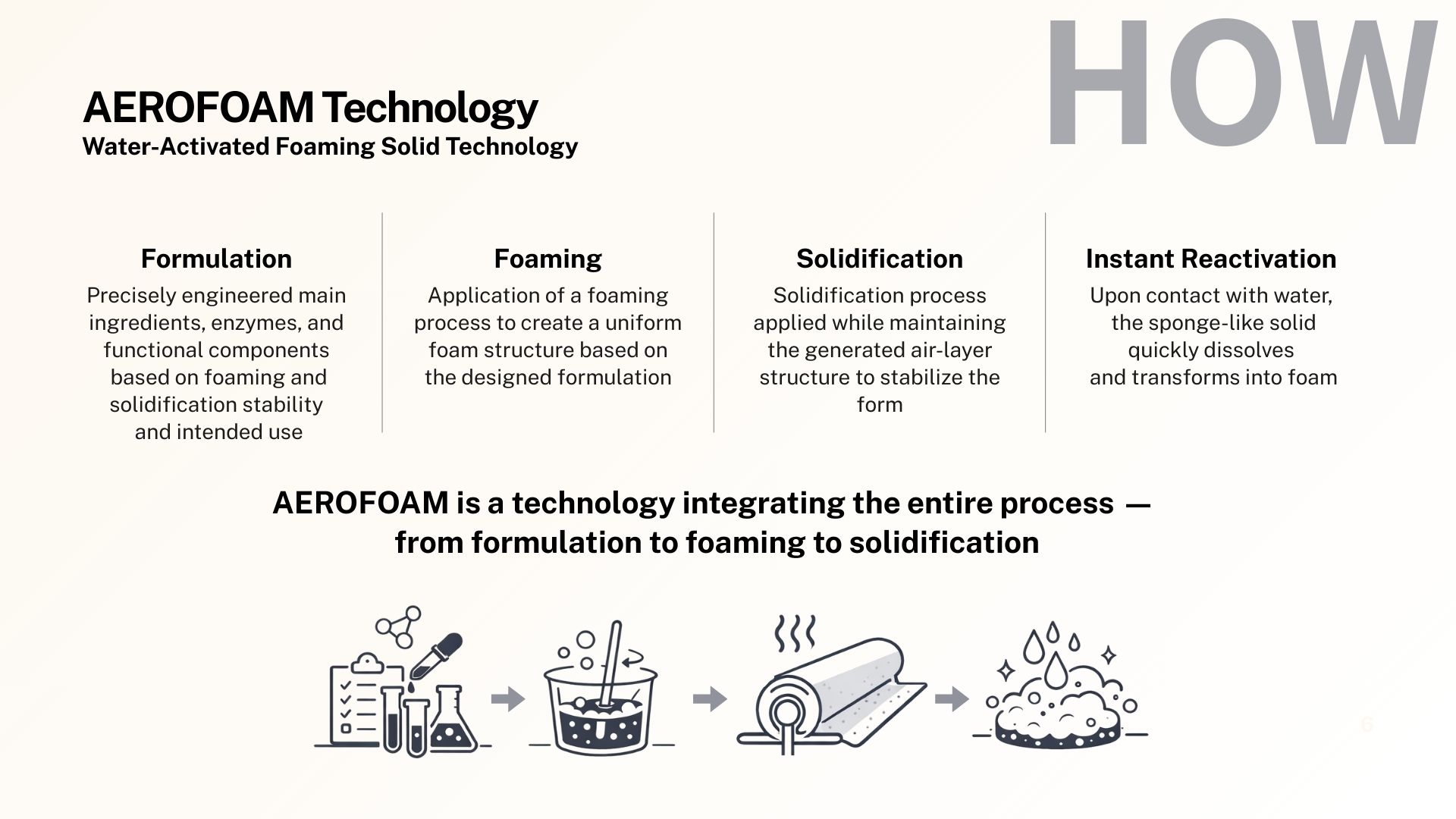 AEROFOAM is an integrated water-activated foaming solid technology that combines formulation design, foaming processes, and solidification technology.