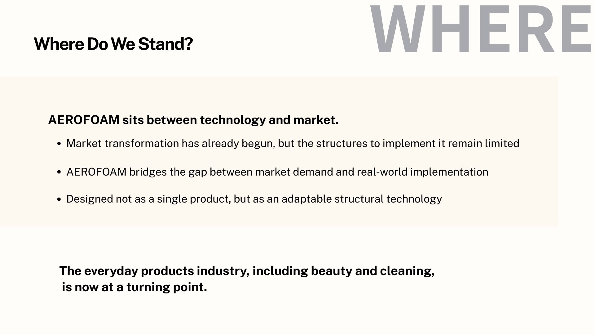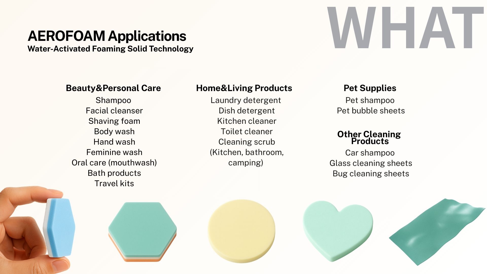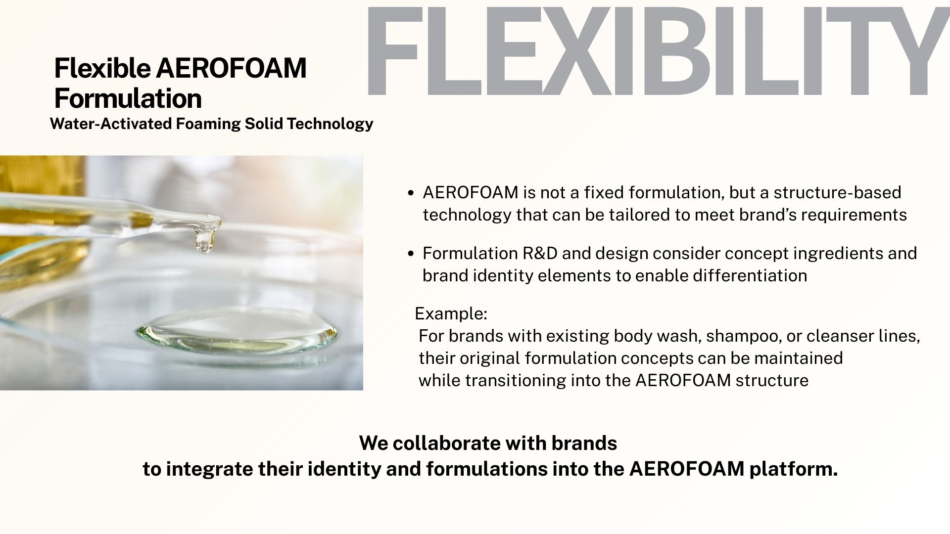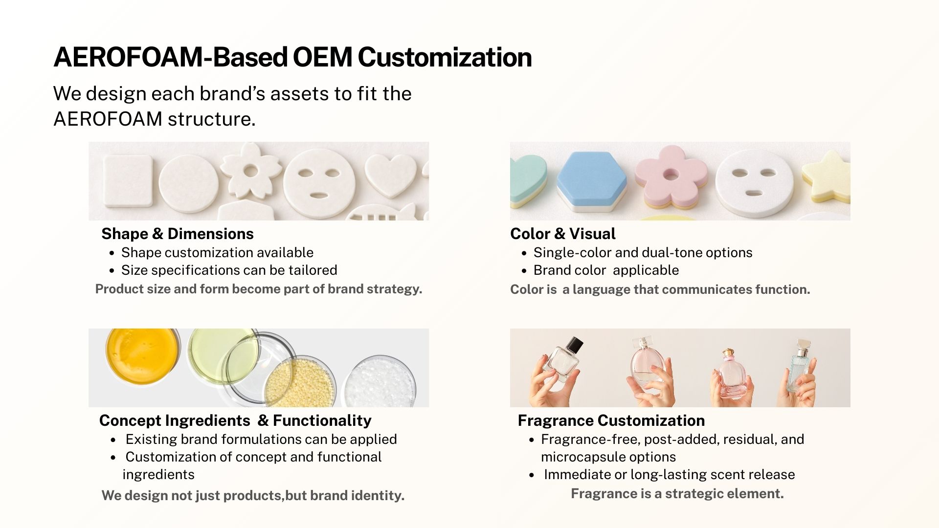 Customization options include product shape, color, fragrance systems, and functional ingredients, enabling brands to create differentiated products while benefiting from the AEROFOAM technology platform.