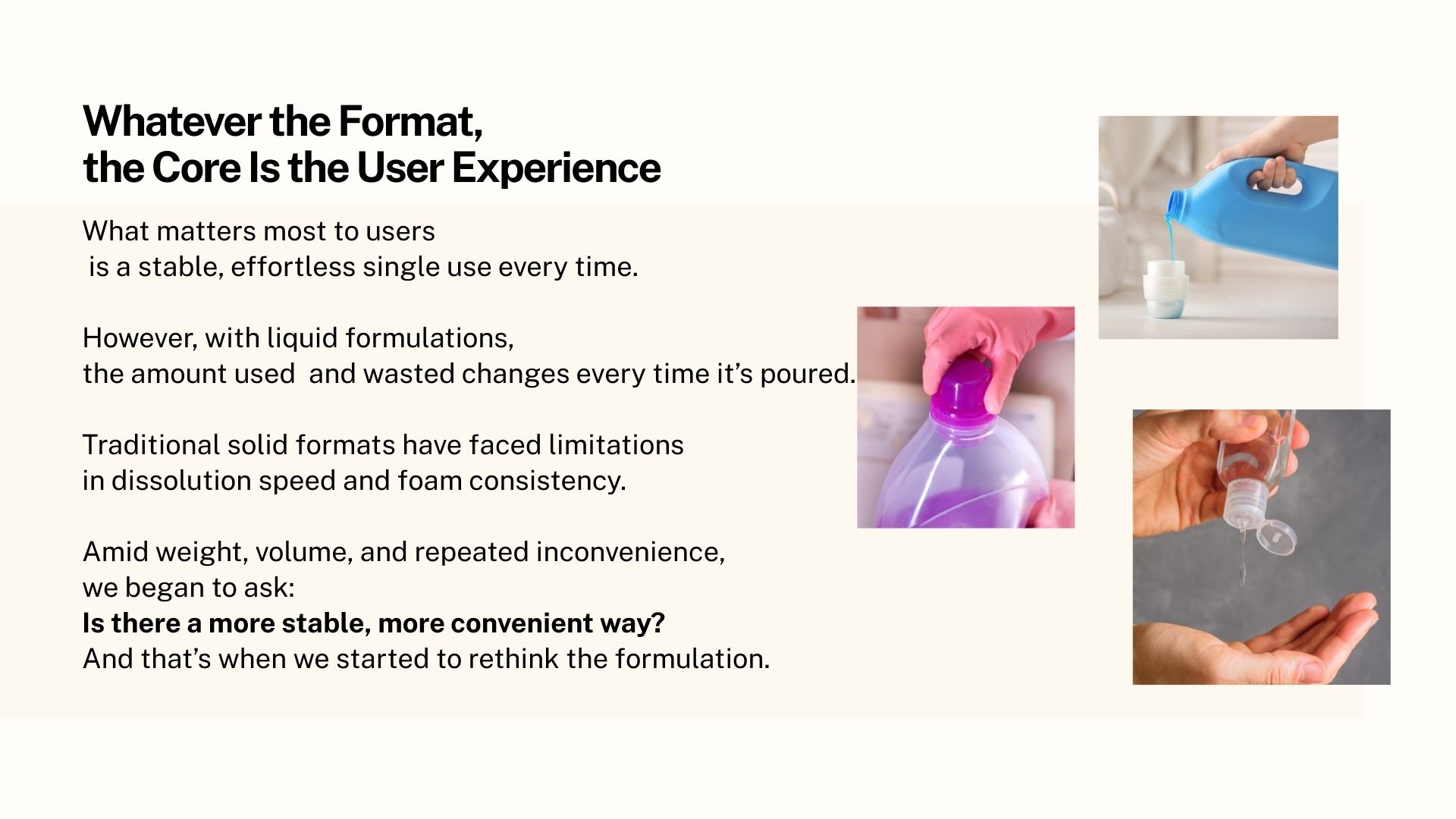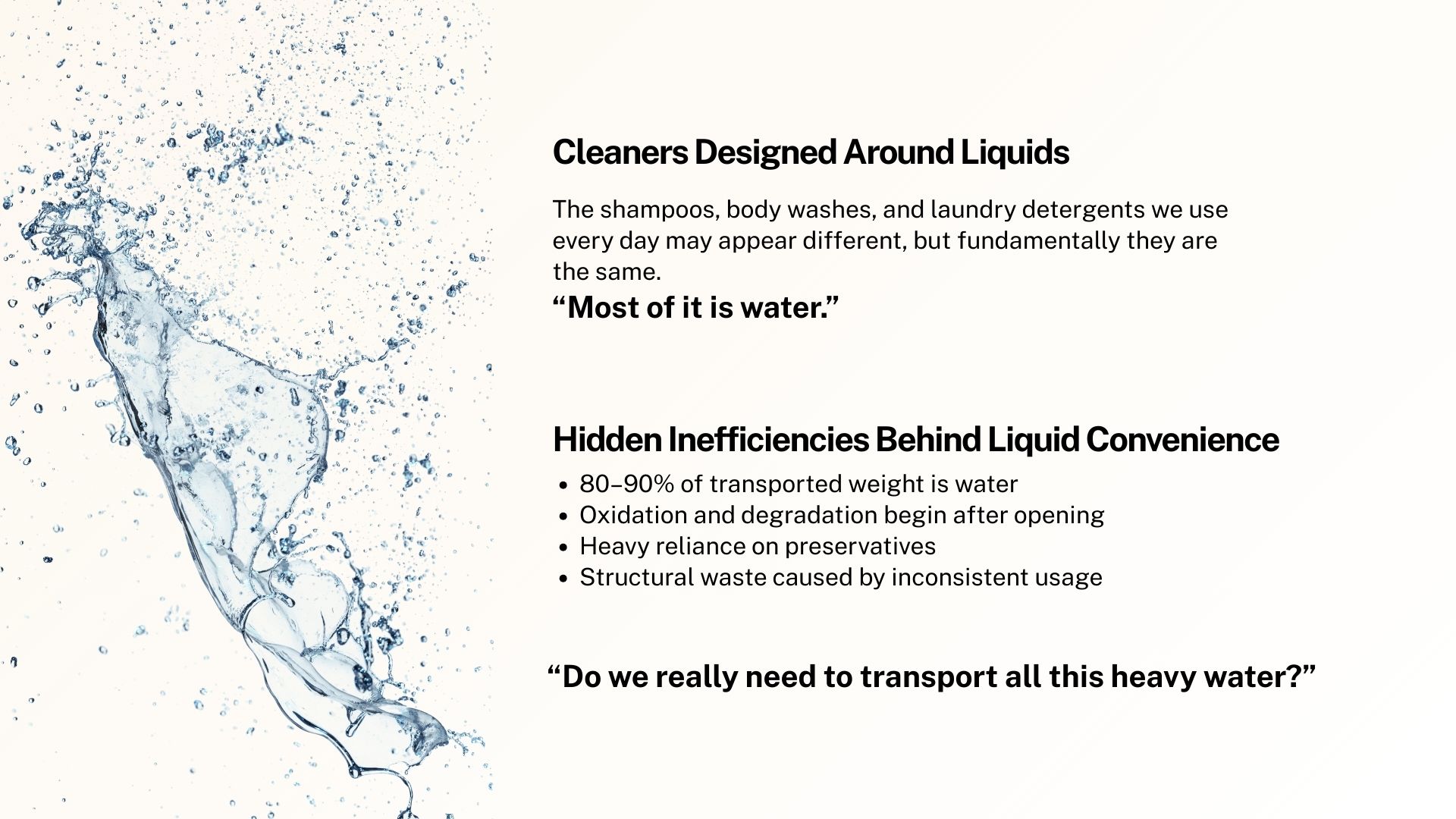 Most conventional cleaning and personal care products are liquid-based and consist largely of water, which leads to higher logistics costs, heavier packaging, and potential product degradation after opening.