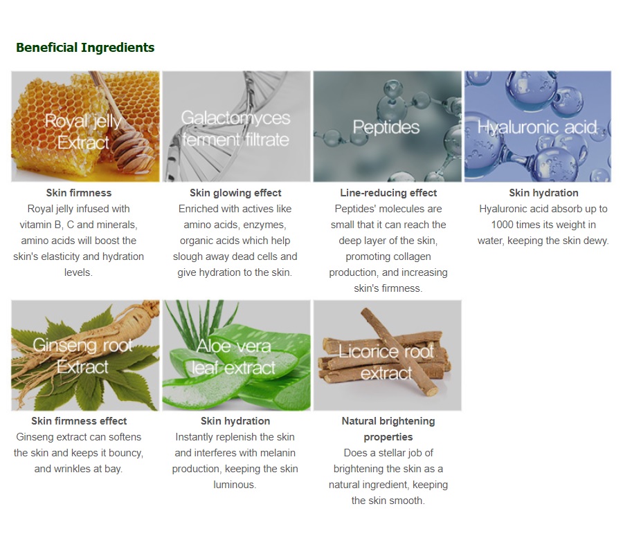 Included Premium ingredients: Royal jelly, ginseng, peptides, hyaluronic acid, panthenol and beneficial herbal ingredients make your skin healthier.