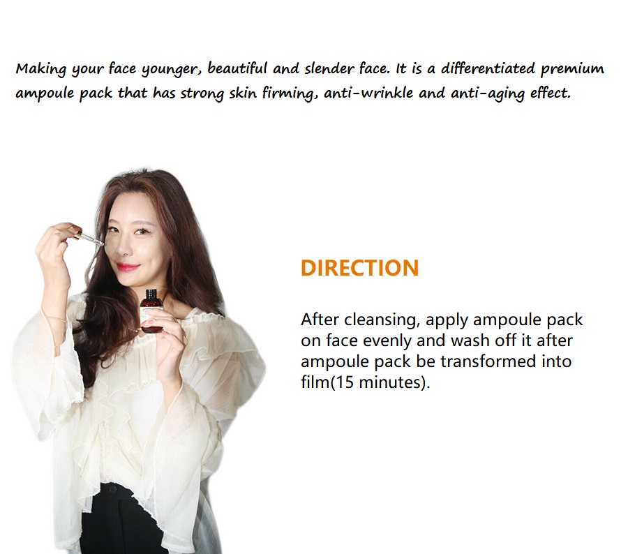 Making your face younger, beautiful and slender face. It is a differentiated premium ampoule pack that has strong skin firming, anti-wrinkle and anti-aging effect.