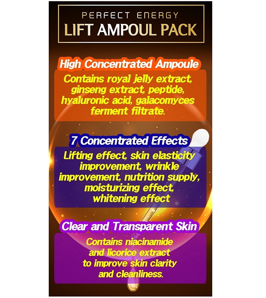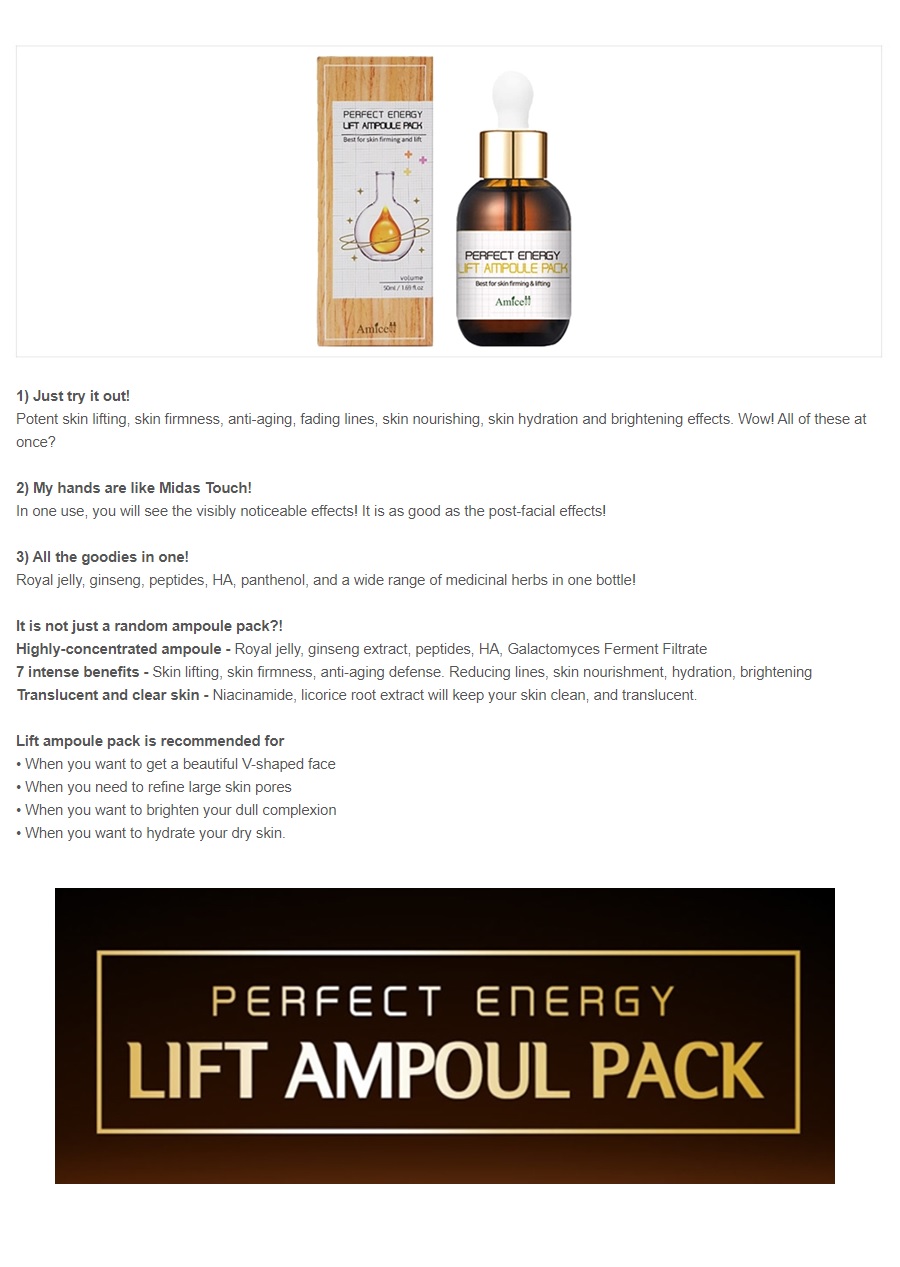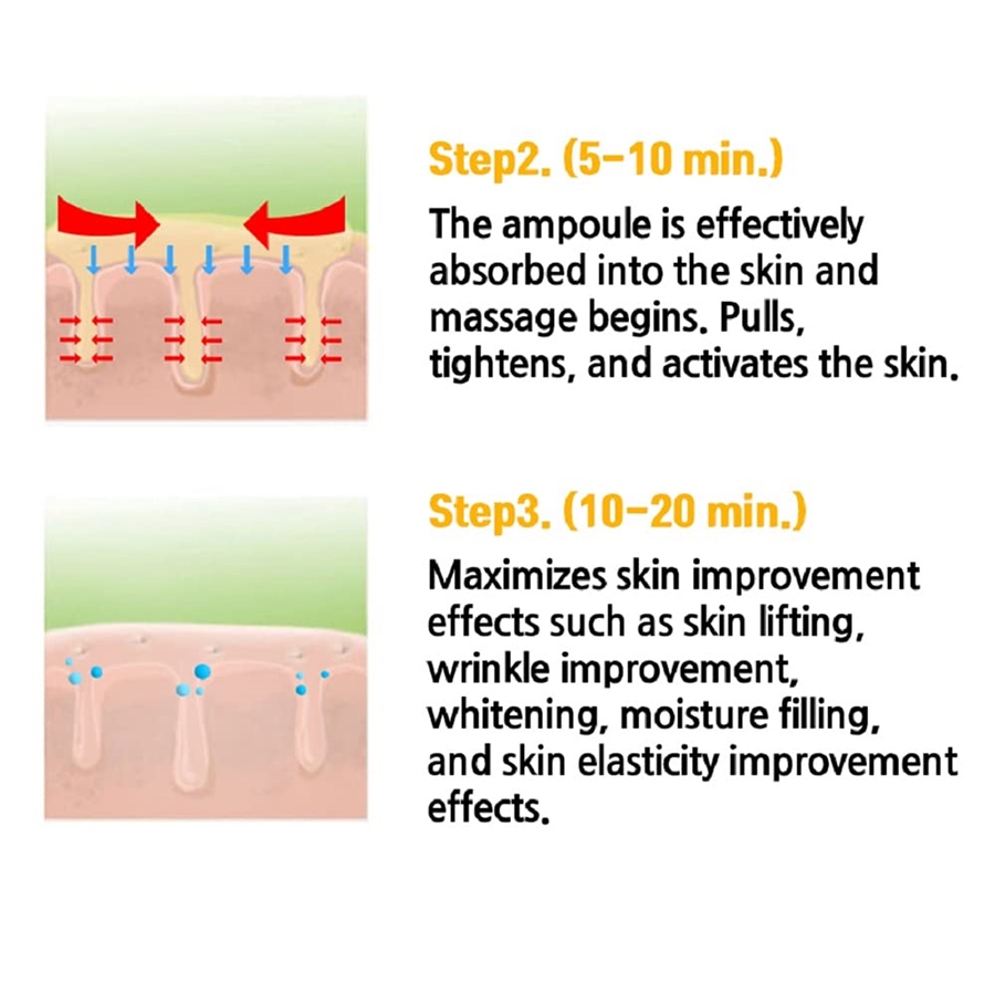 This is a product that allows you to experience the functions and effects of both lifting ampoules and skin care packs as one product. This product tightens and pulls the skin as if the user receives a professional massage, giving a skin lifting, wrinkle improvement, and pore tightening and after ampoule is absorbed, it turns into skin care pack and gives full moisturizing and makes skin smooth.