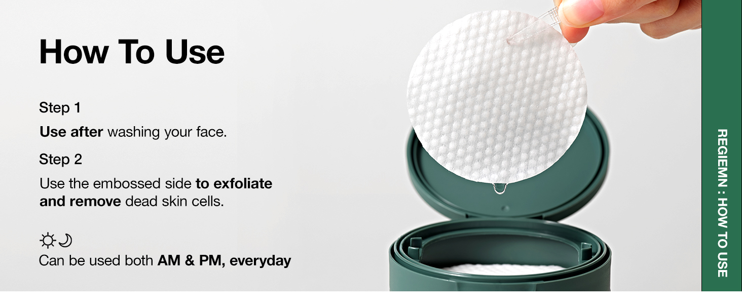 HOW TO USE: 1. After cleansing, swipe your entire face with one side of the toner pad, then follow with the other side for hydration. 2. Gently pat your face to absorb any remaining toner. 3. You can also use the toner on areas like behind the ears and elbows.