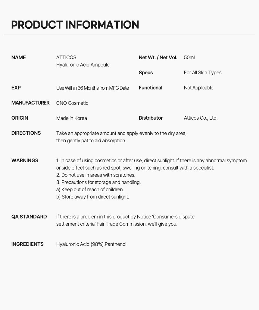 -Formation of moisturizing film -Hydration -kin soothing -Natural Origin -Faster -Deeper -Tighter 01 NMF Natural Moisturizing Factor ▮strong hydrophilicity keeps skin hydrated up to 1,000 times ▮ moisturizes all layers of the skin by binding skin cells to water о2 Elastic Recovery ▮ improves epidermis and dermis structure with excellent moisture supply ▮ Restore skin elasticity by improving skin elasticity by supplying sufficient moisture о3 Skin Tone Improvement ▮ Panthenol prevents evaporation of skin moisture and soothes the skin. ▮ deep moisturization that suppresses dry skin and improves clear and transparent skin tone A Moisturizing Product that is Highly Recommended to These People. -Dull and Dark Skin Even with Makeup -Dry, Flaky Skin -Skin that is Saggy due to Lack of Elasticity WHY? Moisture Tank that draws moisture in the air It strongly attracts moisture molecules in the air like a magnet and releases natural moisturizing factors, which densely fills the dry skin layer. Hyaluronic acid fills the skin with moisture and Panthenol prevents moisture evaporation. Powerful Moisturizing Synergy Effect Hyaluronic Acid + DL Panthenol DL Panthenol 2% Panthenol strengthens the skin barrier and suppresses skin dryness by increasing the ceramide component that prevents fat and moisture from evaporating in skin tissue. with just a drop of highly concentrated ampoule, Full of Moisture All Day 99.9% Natural Ingredients Natural moisturizing factor N.M.F is a moisturizing ingredient naturally present in the skin and prevents dryness by maintaining adequate skin moisture + Plus Tip Stay Hydrated All Day Long Tips for Using Ampoule Hyaluronic acid can be pushed back if it is not absorbed sufficiently into the skin due to its tight viscosity. Tap it with your hands to absorb it One drop before going to bed Just one drop before going to bed will make your skin tightly overnight! Before going to bed, apply a drop of hyaluronic acid after applying basic cosmetics. In the morning, you can feel the skin tension and clear skin that built up overnight. When you want dense moisturizing all day long If you add a drop of hyaluronic acid ampoule to your basic cosmetics you are using, you can feel the extreme moisture by adding the moisture of hyaluronic acid and the moisturizing effect of cream. When you want honey glow makeup Add A Drop of Hyaluronic Acid to your basic base makeup product. You can experience sparkling honey glow makeup. If you add too much, it can be pushed back, so make sure to only use just one drop!
