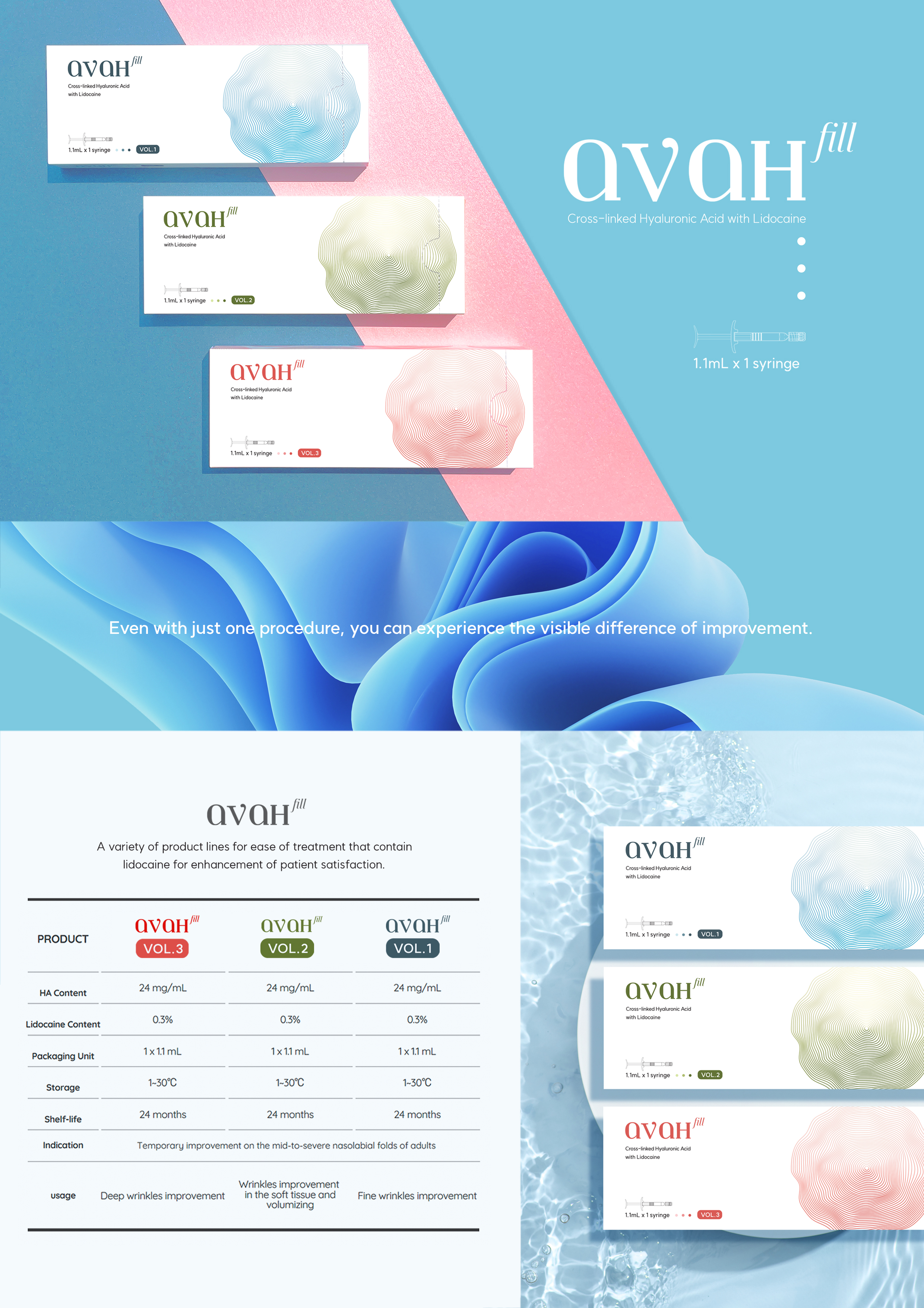 With its proprietary HoPE (Homogenous Process and Equilibrium) Technology, AVAHfill is a hyaluronic acid filler with high stability and excellent volumizing effect.