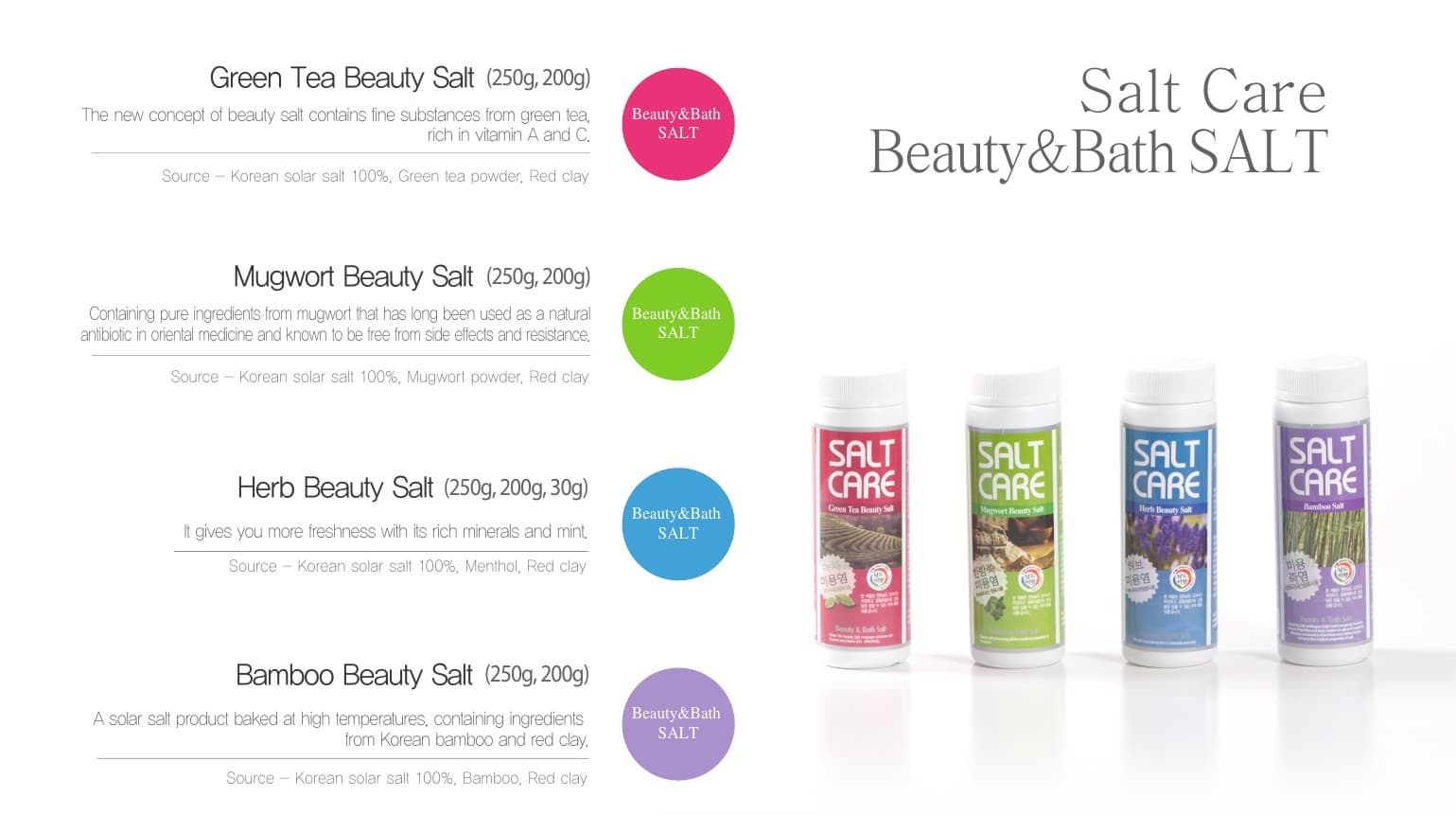 Source - Korean solar salt 100%, Green tea powder, Red clay