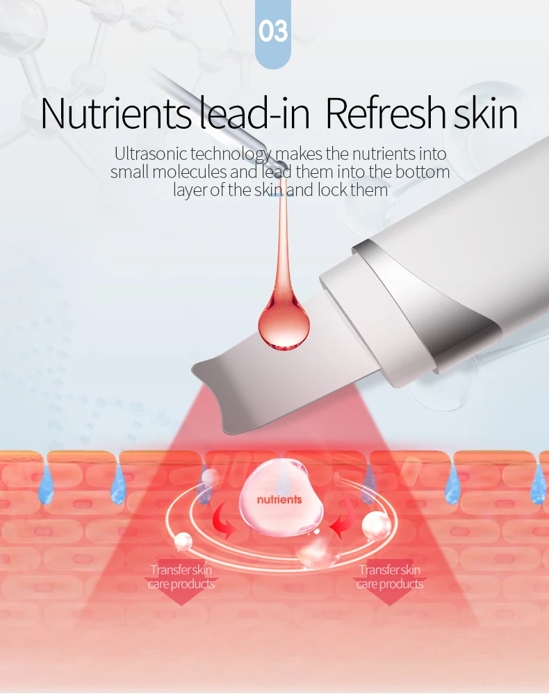 Product selling point:1. Using high-frequency sonic vibration mode to shatter the dirt in the pores;2. Introduction of sound waves, shattering nutrients into small molecules and introducing them into the bottom layer of the skin;3, clean skin metal plate, fit the facial curved design;4, a button switch, easy for novices to use freely.