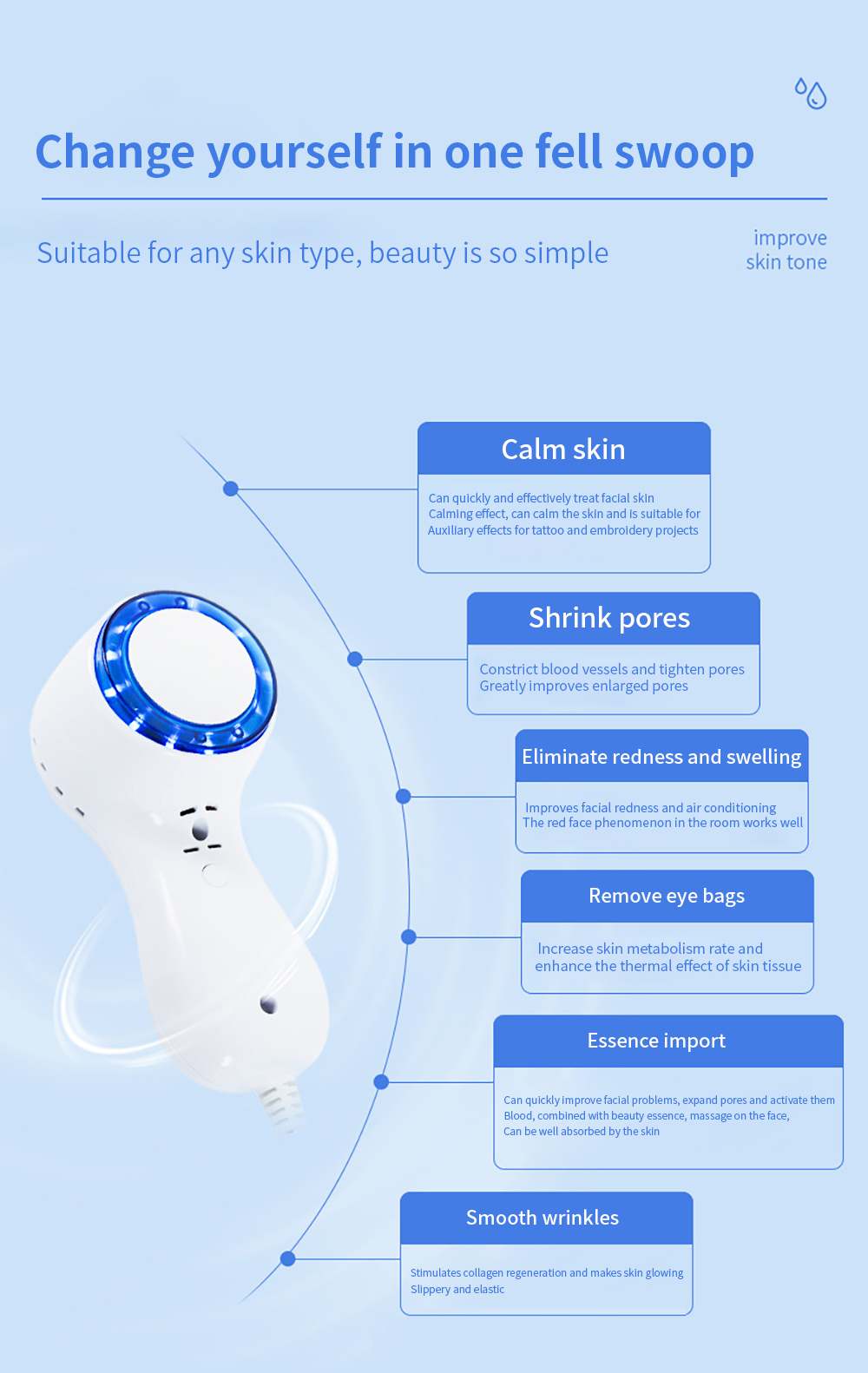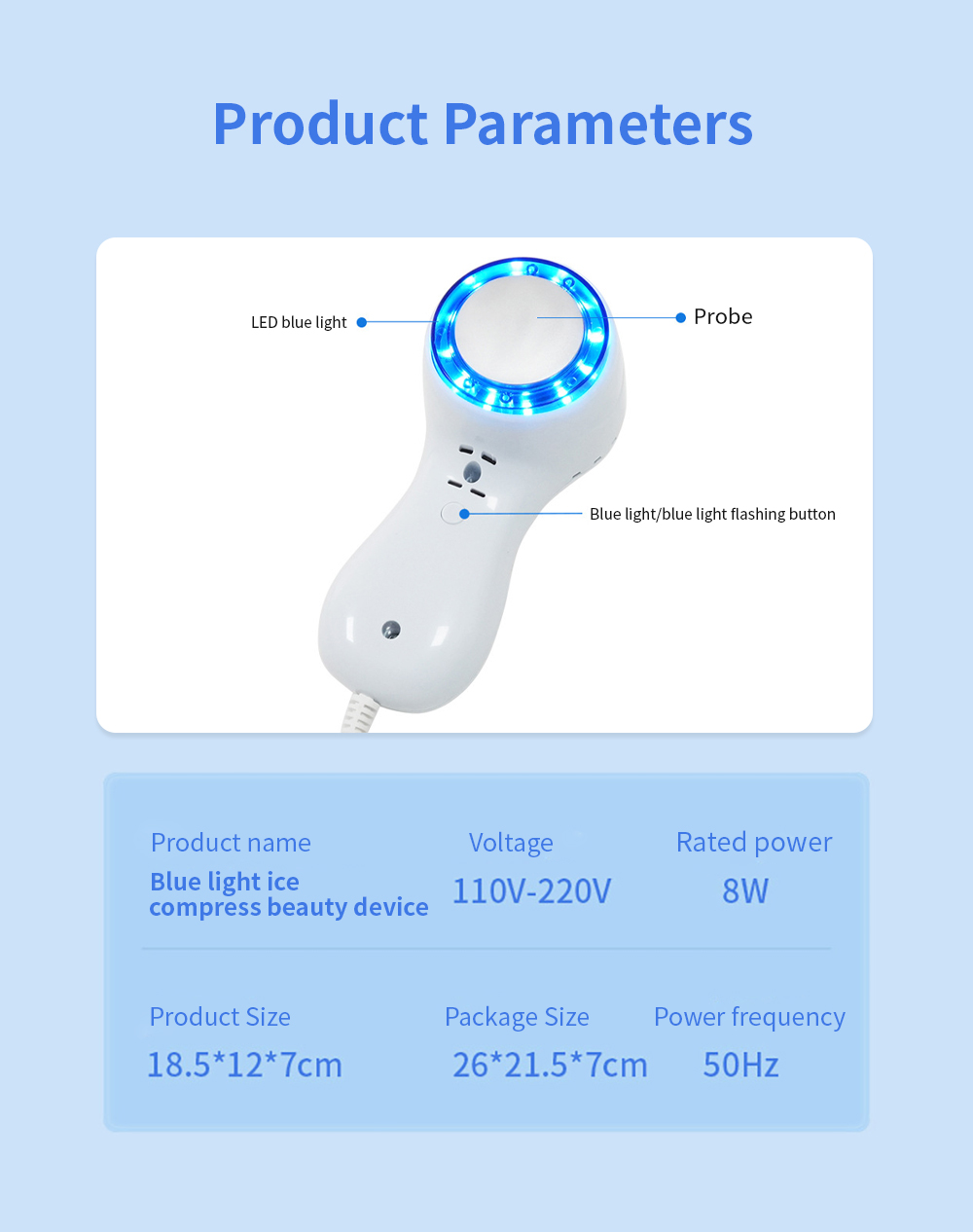 Feature1,It strengthens the original fiber, making skin elastic, smoothing wrinkles and crow's feet.2,With shrink blood vessels, and effectively reduce varicose veins, red rise, venous return function, it can reduce redness, anti-inflammatory and detoxification.3,It promotes skin metabolism which has effect on removing eye bags and dark circles.4,Blu-ray reduces the oil secretion, preventing acne and pimples.5,The cold temperature quickly close the pores and lift up your skin.6,Cold temperature will also assist in treating cold and fever