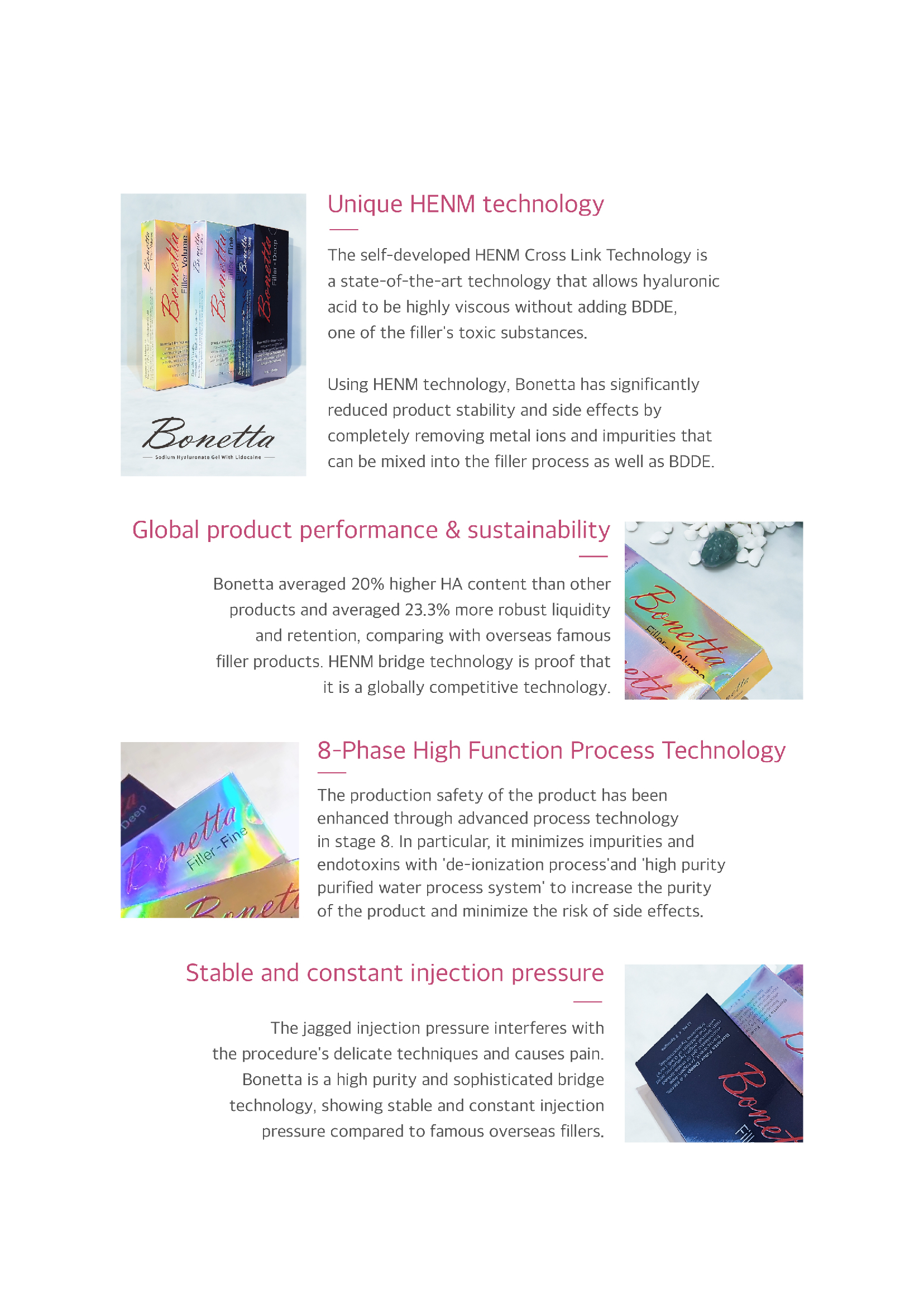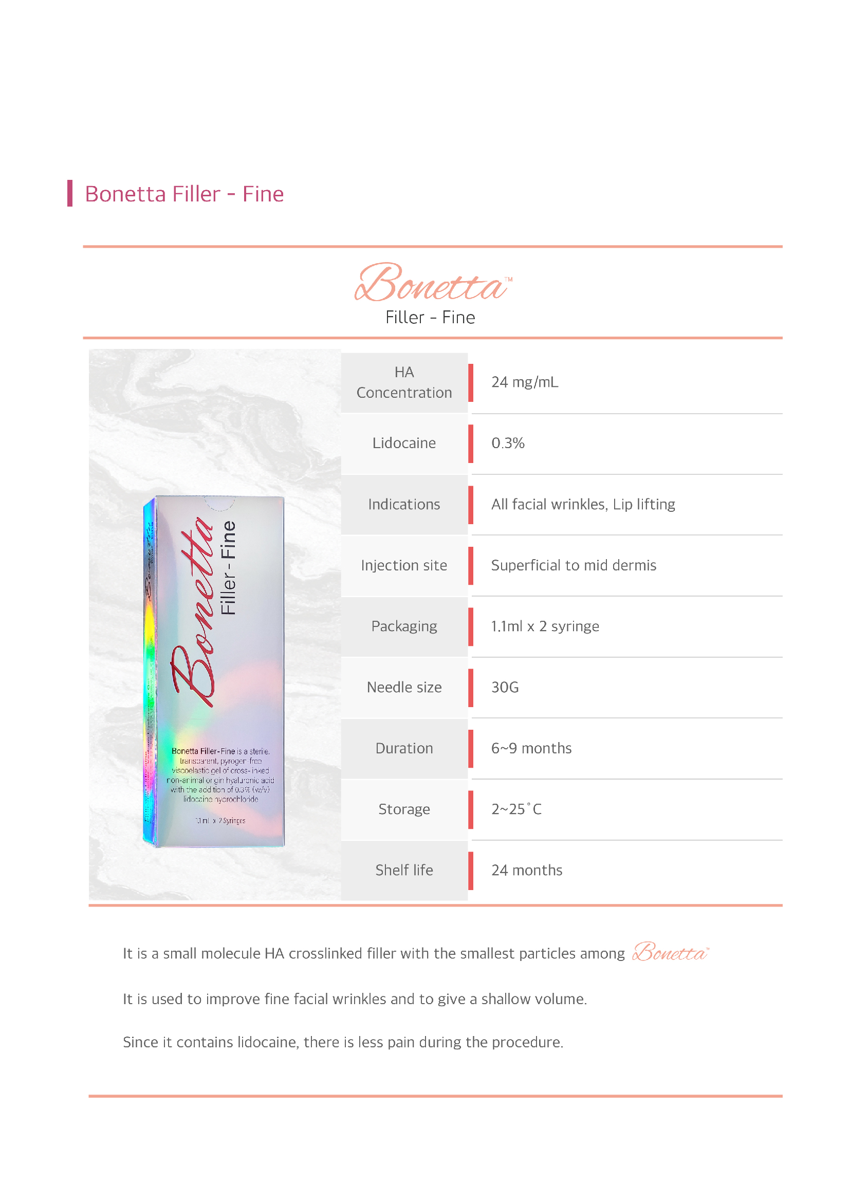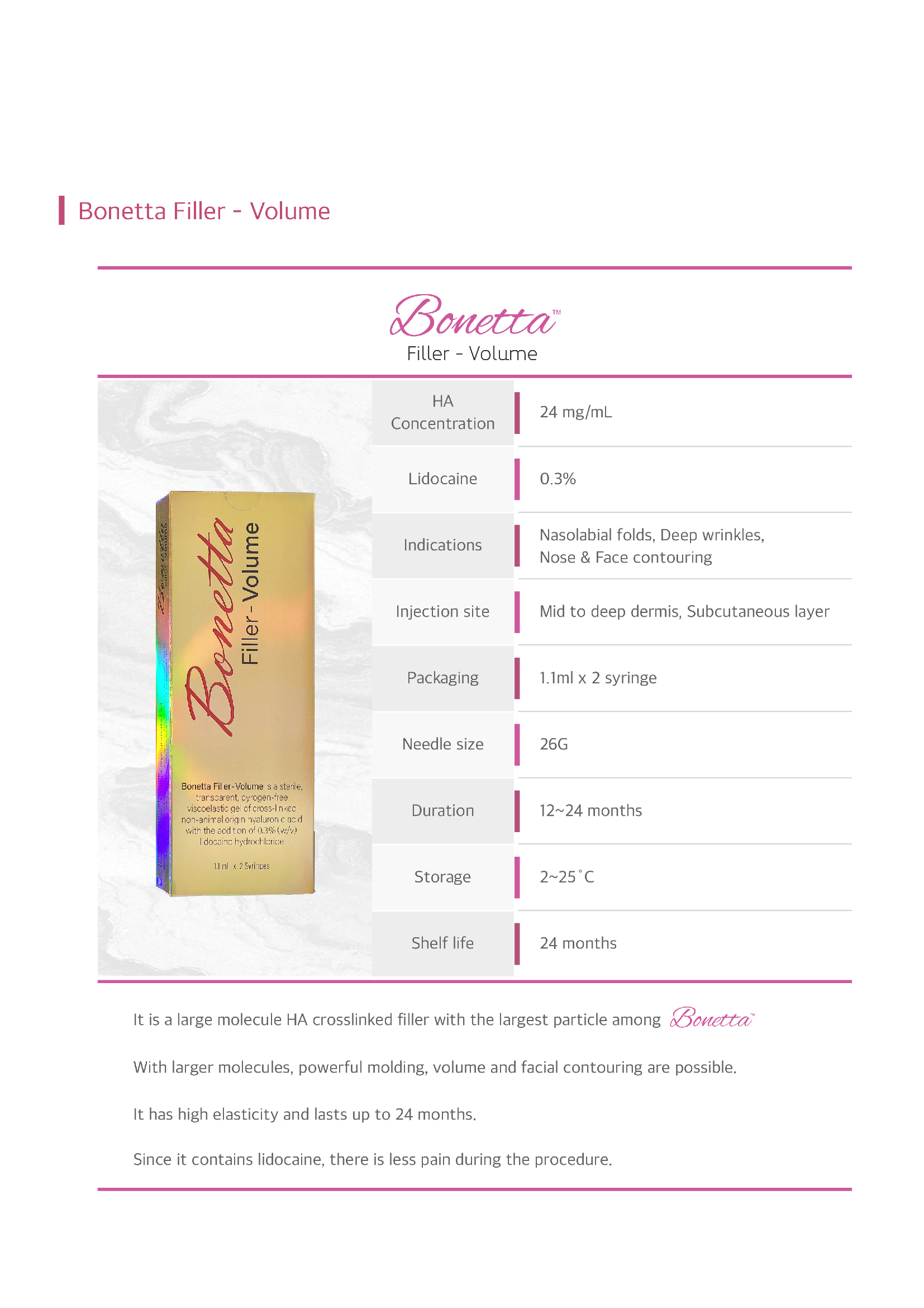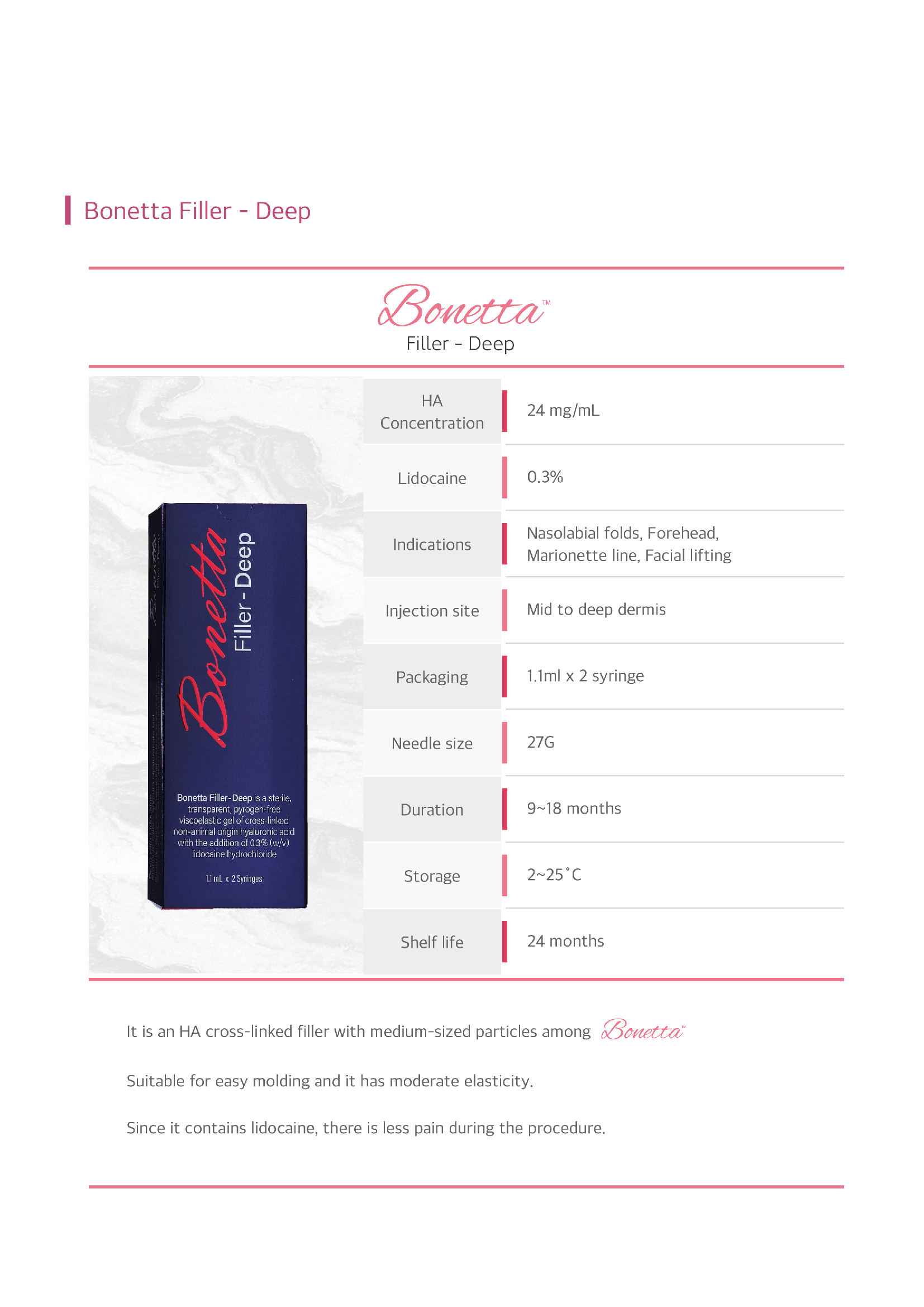 Bonetta Filler is ready to use straight out of the box and includes high-quality needles for precise application. The filler contains 0.3% Lido, providing a pain-free experience for the patient.