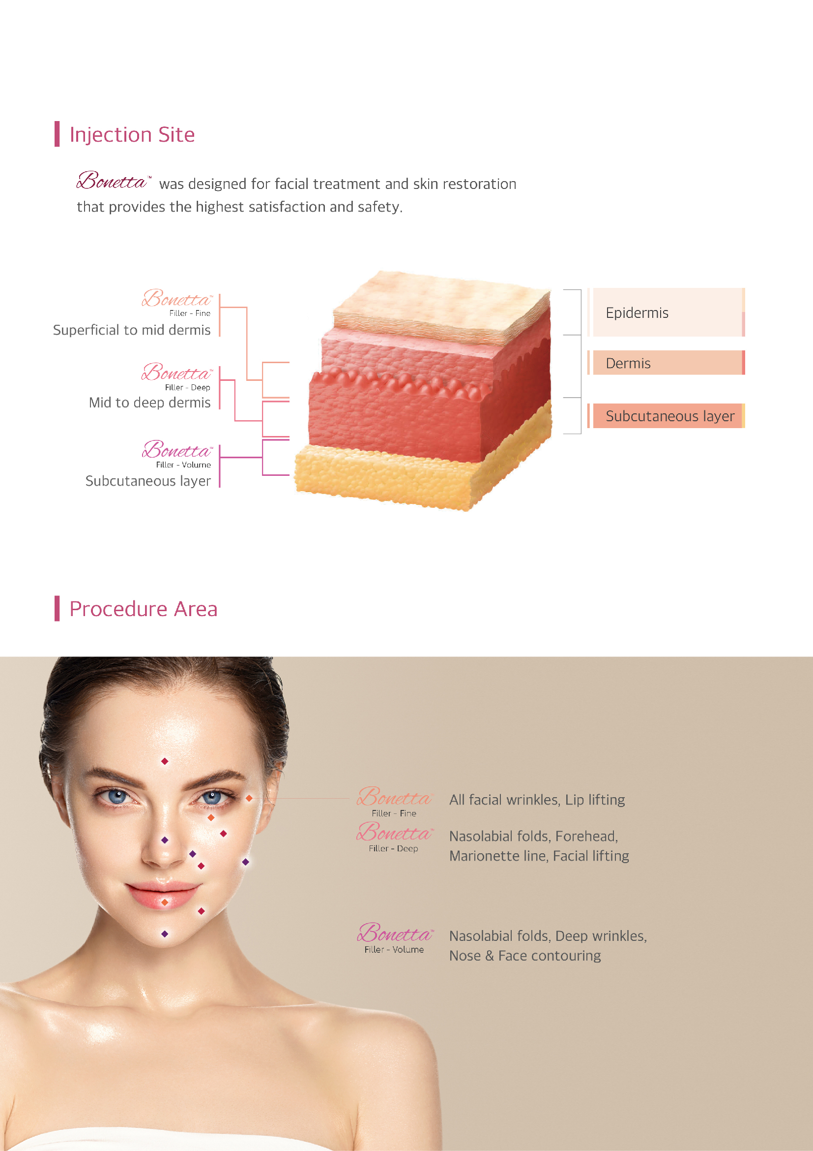 Bonetta Fine: This dermal filler is ideal for those battling the first signs of aging. It is designed to fill fine lines and wrinkles on the face, such as forehead creases, while moisturizing the lips and smoothing the neck. The effects can last up to eight months with just one treatment.