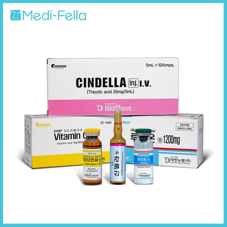 Volume : 5mL x 10AIngredient : Thioctic acid 25mgEfficacy : Elasticity improvements, Flawless skin tone, Brightening effectsDESCRIPTION– Brightening skin color as injection tones up the entire face– Increase skin elasticity and decrease wrinkles– Feeling less exhausted after daily activity– Activate fat resolving and effectively reduce body fat– Regulation of blood glucose causing effects on geriatric diseasesWhat is α-lipoic acid?The a-lipoic acid is the fatty acid in small doses which is essential substance to produce the body of its energy.It also has 400 times more of antioxidative activity than vitamin C,E.It has an excellent effect on whitening, elasticity, also palpates the energy consumption and appetite suppression.It decreases body weight, as a result of increasing in glutathione production.EFFECTS ON CINDELLA INJECTION * DietㆍAnti-obesity EffectsㆍHeal edema and cold constitutionㆍReduce fatty liverㆍAppetite suppressant EffectsㆍAnti-OxidationㆍIncrease glutathione productionㆍCure chronic fatigueㆍDetoxification effects on heavy metalsSkin ImprovementsㆍWhitening effectsㆍElasticity improvementsㆍFlawless skin tone