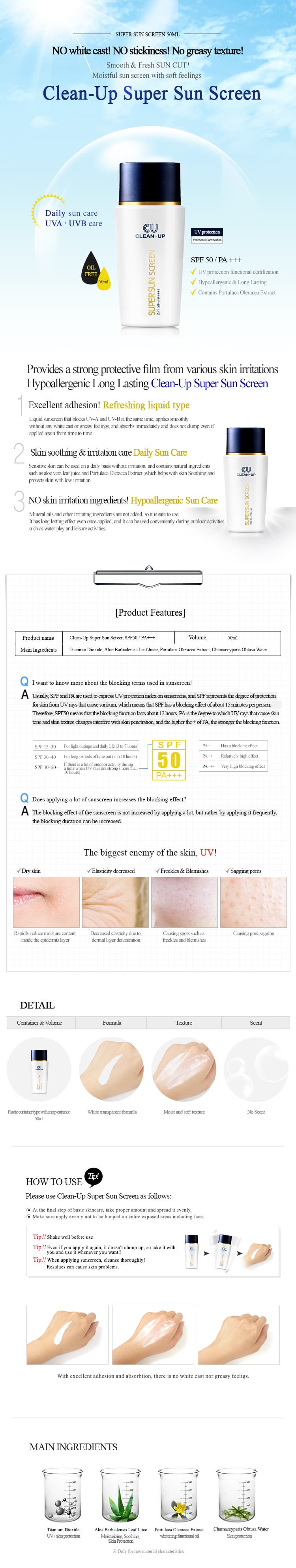 [Key Ingredients]· Zinc Oxide - block ultraviolet rays· Titanium Dioxide - block ultraviolet rays· Ethylhexyl Methoxycinnamate - block ultraviolet rays· Aloe Barbadensis Leaf juice - moisturizing effect, skin soothing· Portulaca Oleracea(Purslane) extract - skin soothing, brightening