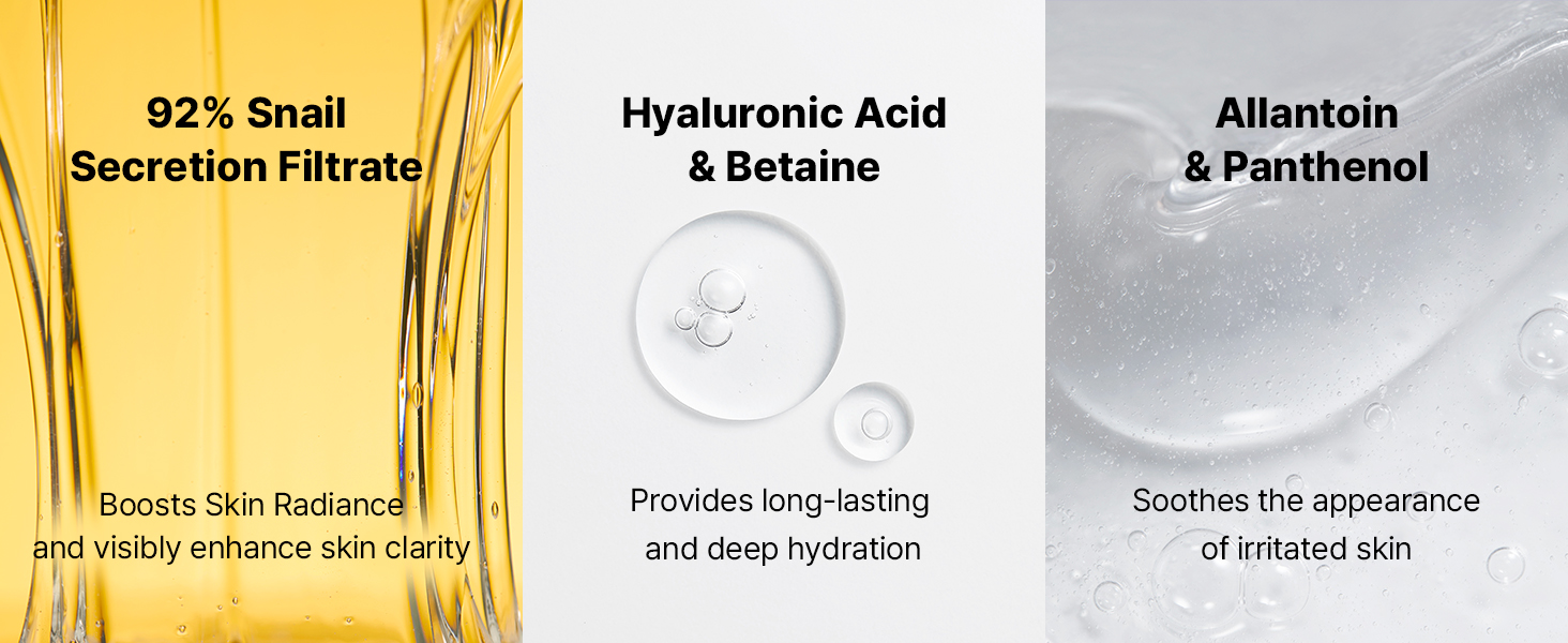 96% Snail Mucin – Delivers deep nourishment to promote skin healing, hydration, and elasticity.