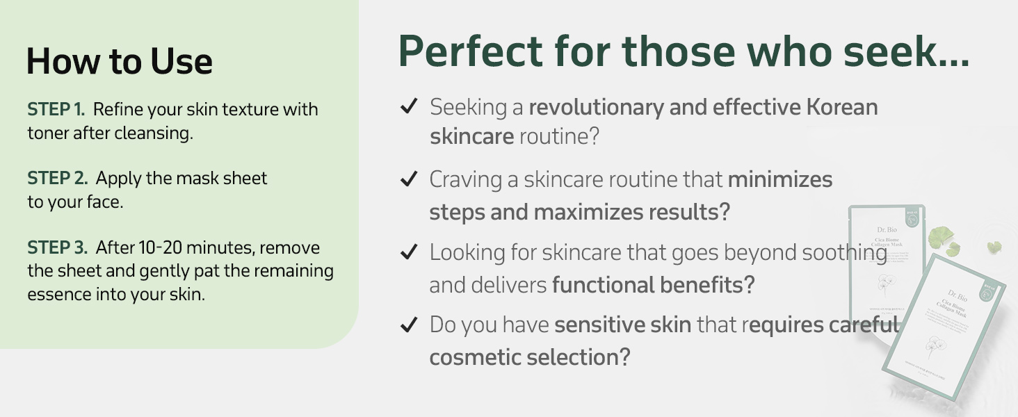 Soothe and revitalize stressed skin with the Dr. Bio Cica Biome Collagen Mask — a vegan sheet mask formulated with Centella Asiatica (Cica) and plant-based collagen to restore moisture, calm irritation, and improve skin firmness.
