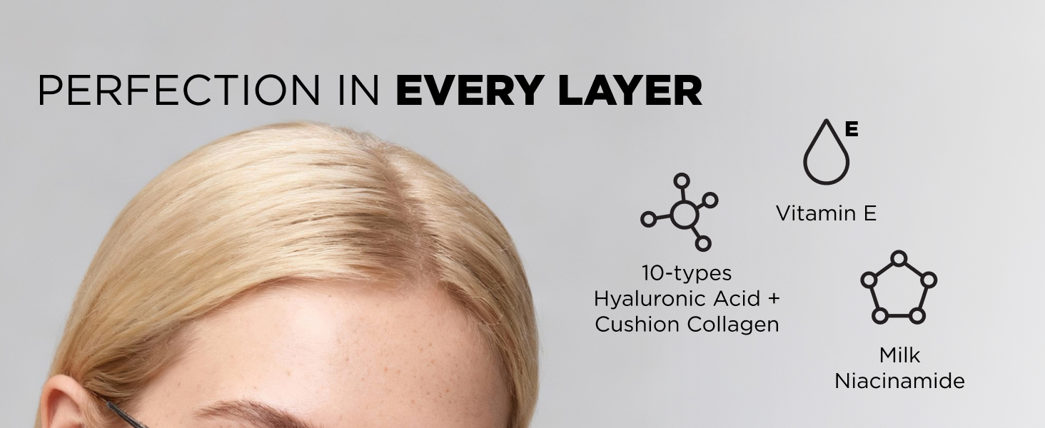 Enriched with 10 types of Hyaluronic Acid to deeply hydrate and firm the skin.Delivers lasting comfort and nutrients for a natural glass-skin glow with a light, skincare-like texture.