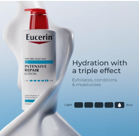 Eucerin Intensive Repair Body Lotion is a dermatologist-recommended body moisturizer specially designed for very dry skin. This advanced formula delivers 3-in-1 benefits: deep hydration, gentle exfoliation, and skin conditioning.