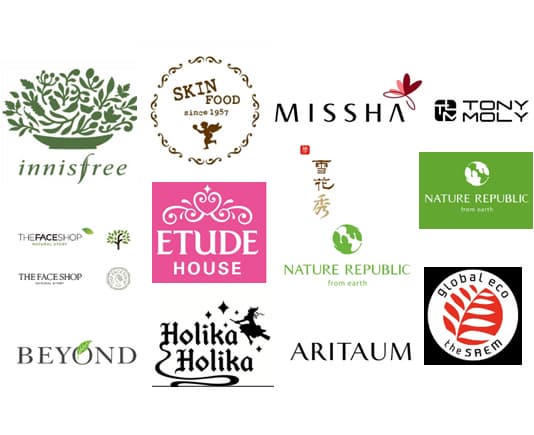 Farmstay,TonyMoly,Innisfree, Missha, Lanegie, HolikaHolika, The face shop, Skin food,Lador, Ettude House, nature republic, Mizon, Dr.Jart, Cosrx ,CP-1, ,Mise en scene, Lador, DerMeiren, Medius Mask, Lebelage, Jigott, Petitfee&Koelf, Elizavecca, Beauu green, JM Solution etc.