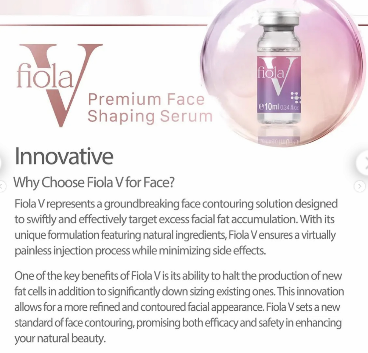 Fiola V🌸Fat dissolver🌸What is fiola V?Fiola v is a premium Korean fat dissolver produced by Medi-Fella. fiola V is a new-generation innovative fat dissolver and is truly an upgrade from fat dissolvers of previous generations. Specifically designed for the face, Fiola V can provide a noticeable lifting effect, as it targets and reduces the volume of fat cells. Fiola V can be used in any area of the face that has fat.💐- Effects of fiola V🔸 Rapidly reduces the size of fat cells. Provides a lifting effect to the face and enhances the contours of the body.🔸Increases the body’s metabolic rate and improves blood circulation.🔸Promotes deep collagen synthesis in the skin, thus creating a lifting and tightening effect of the skin.🔸Brightens the skin complexion and improves the skin condition🌸Application Areas of fiola VFace- Fat around the cheeks, cheekbones, and jawline- Double chin- Facial fat disposed asymmetrically- Skin with reduced elasticity➜ fiola V can provide an overall facial lifting effect while improving the elasticity of the skin