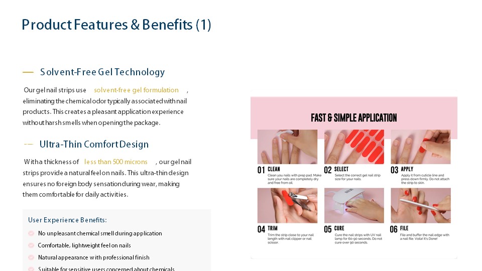 - Our gel nail strips use solvent-free gel formulation ,