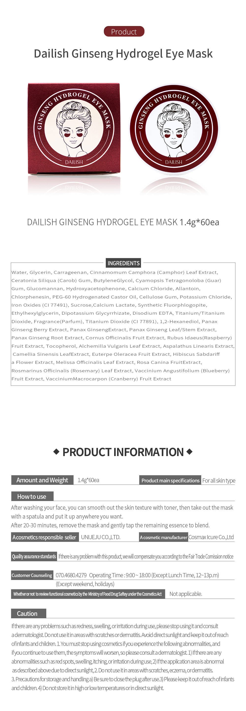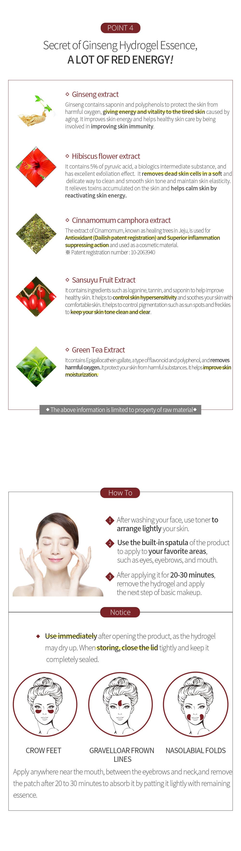 • Main ingredients : Panax Ginseng Root Extract, Hibiscus Sabdariffa Flower Extract, Cornus Officinalis Fruit Extract, Camellia Sinensis Leaf Extract, Cinnamomum Camphora (Camphor) Leaf Extract