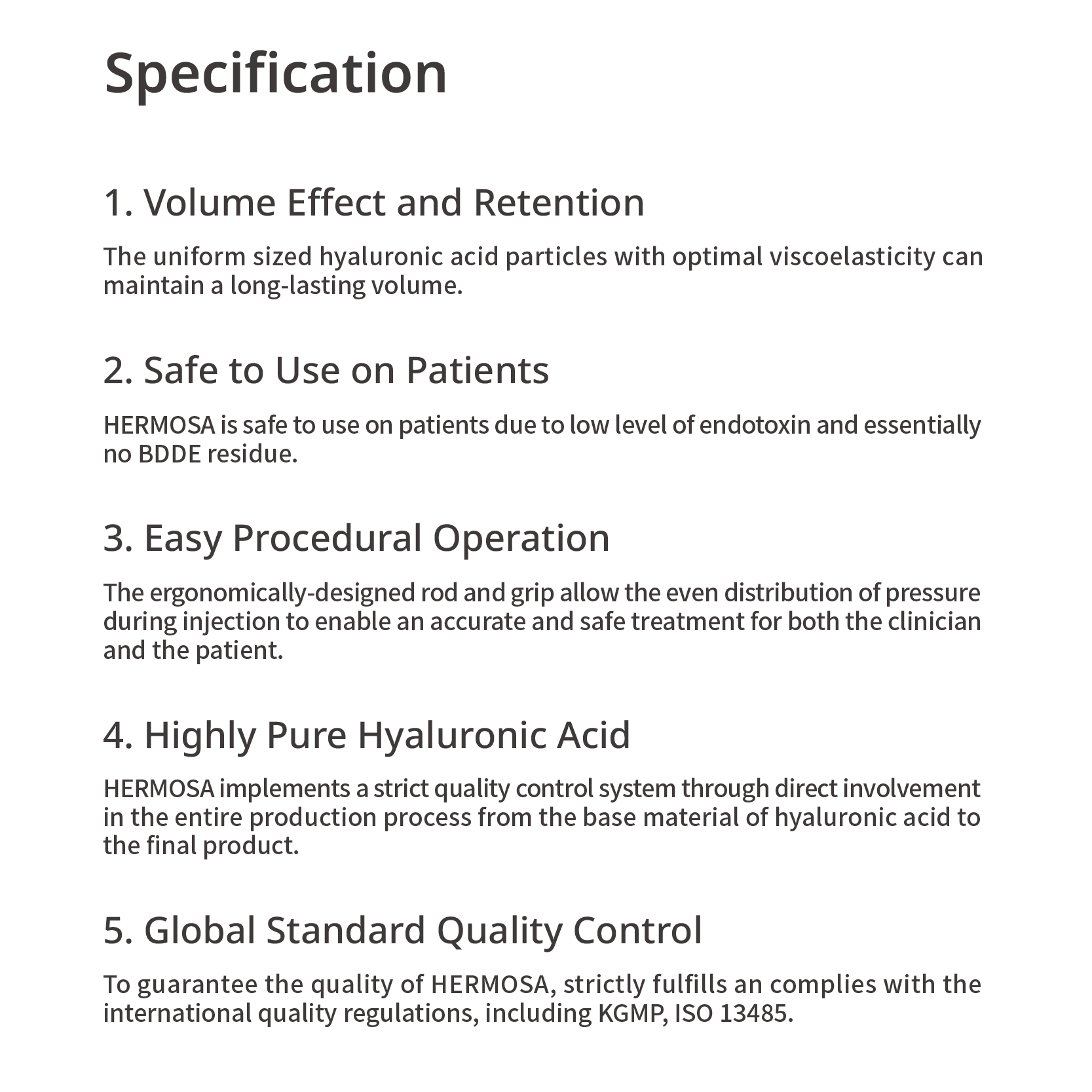 • Highly Pure Hyaluronic Acid) HERMOSA implements a strict quality control system through direct involvement in the entire production process from the base material of hyaluronic acid.