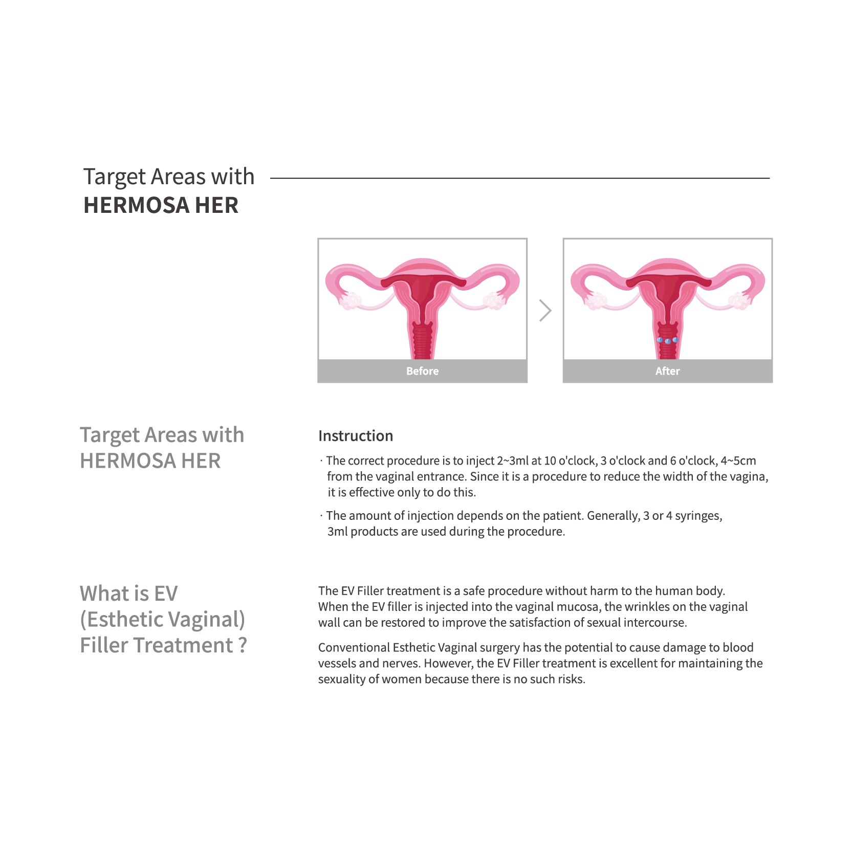 Advantage of HERMOSA Her EV Filler Hermosa Her is a proven product that has been officially approved by the Korea Food and Drug Administration (KFDA). Hermosa Her’ is superior in durability and volume maintenance due to its higher density and crosslinking rate than the regular HA filler used on the face. Hermosa Her helps the collagen regeneration of the injected area and maintain a natural voluminous feel for a long time. A Person who need HERMOSA Her A Person with phobia of surgery A person who does not have the time to treat in a busy daily life A person who wants a more satisfying sex life A person who wants a quick recovery after treatment A person who does not want to inform to spouse about the treatment