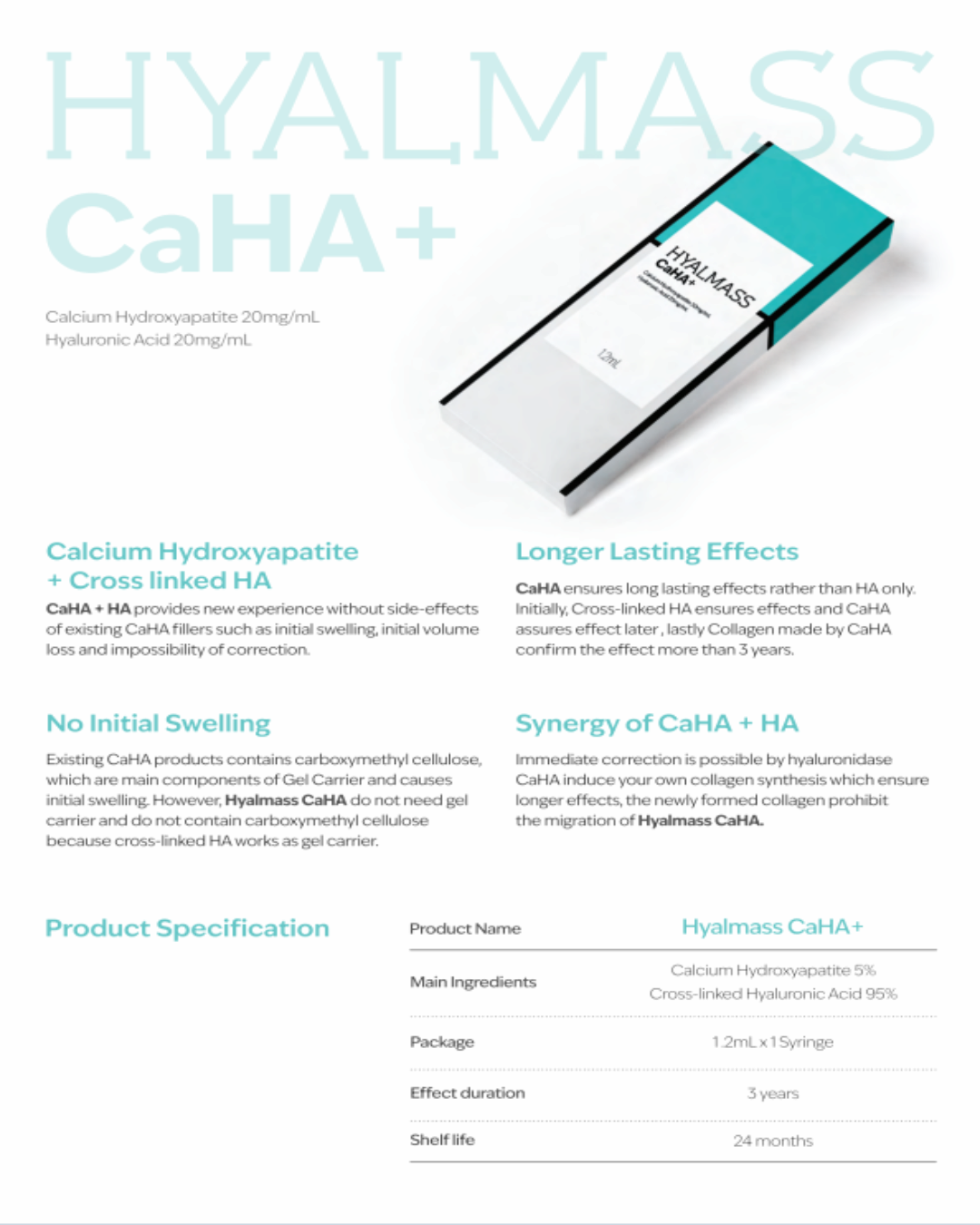 Hyalmass CaHA+ is an advanced skin booster combining Calcium Hydroxyapatite (CaHA) and Hyaluronic Acid (HA) to deliver both immediate volume correction and long-term collagen stimulation. It provides visible lifting, elasticity, and skin regeneration with minimal downtime.