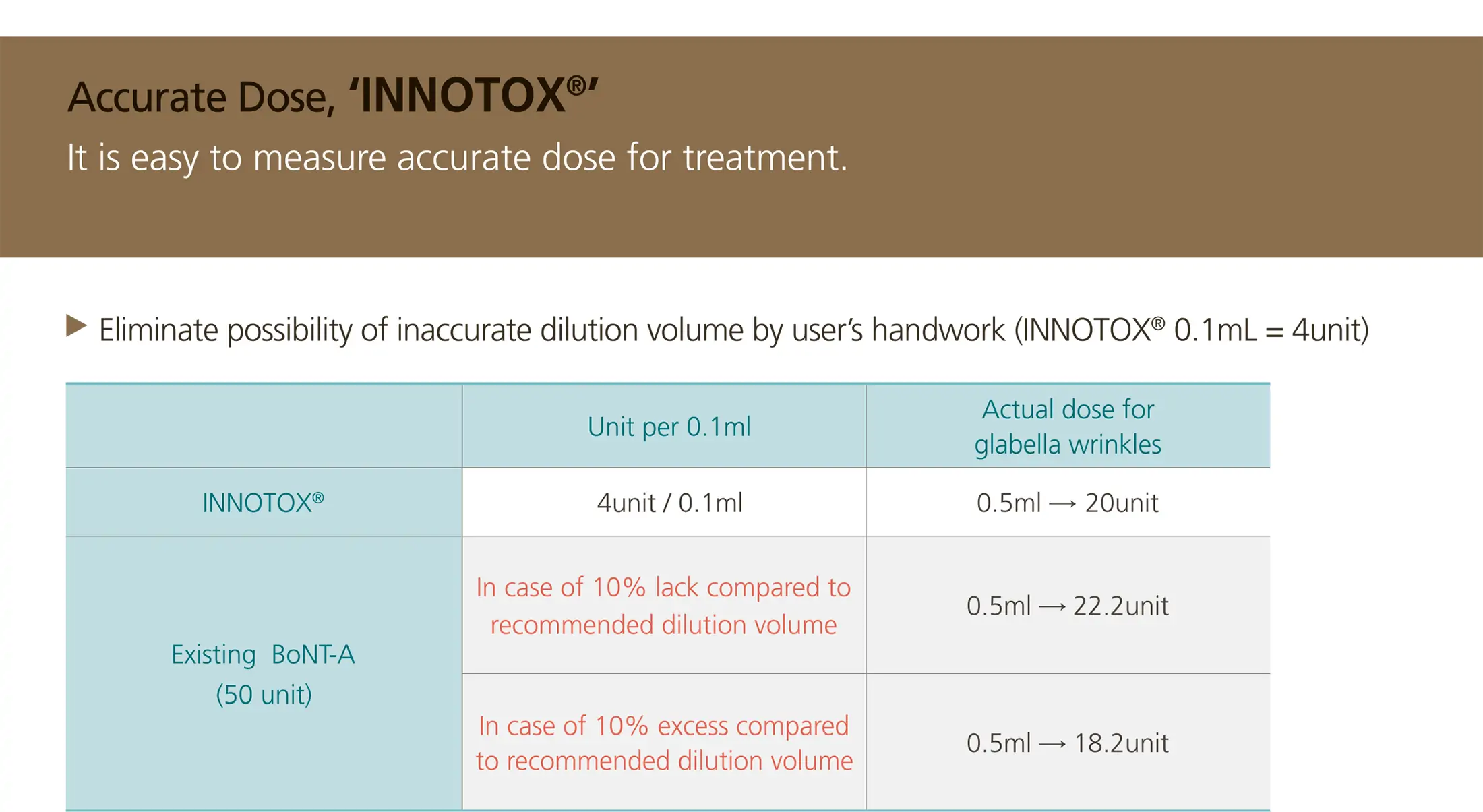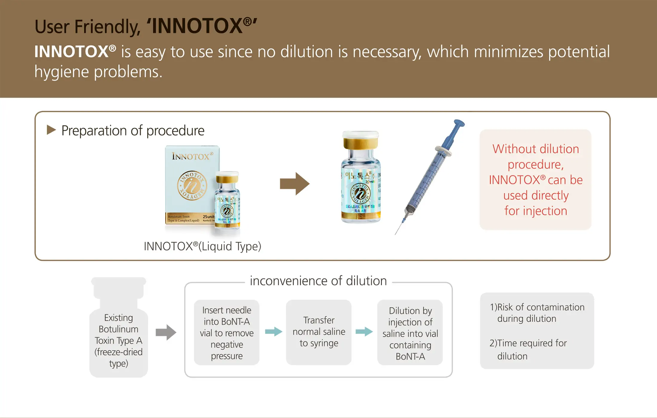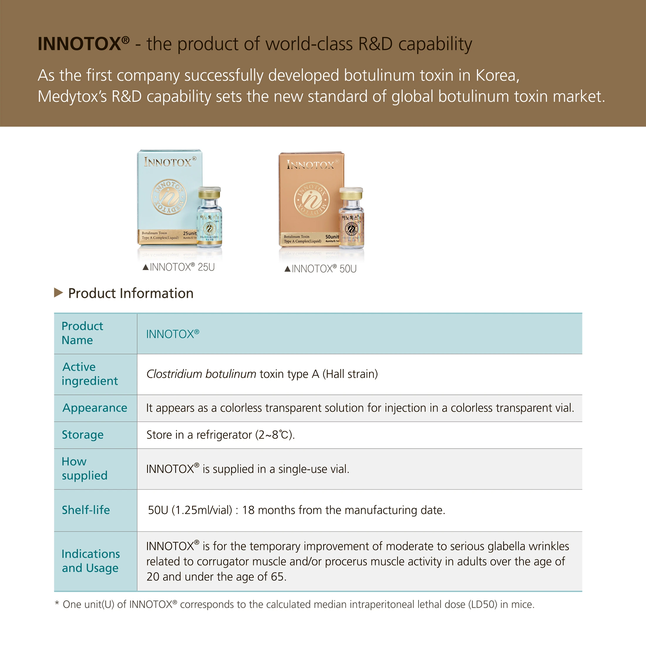 Innotox is a Clostridium botulinum toxin / type A in the form of a finished liquid phase. Available in vials of 50 and 100 units.