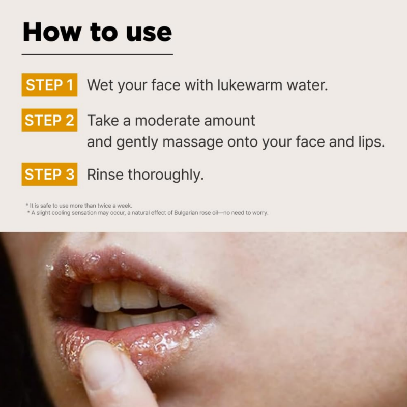 HOW TO USE: Wet face with lukewarm water. Apply a small amount to damp face and gently massage, especially in dry and rough areas. Rinse well. Use twice a week after cleansing. Can also be used as a lip polish.