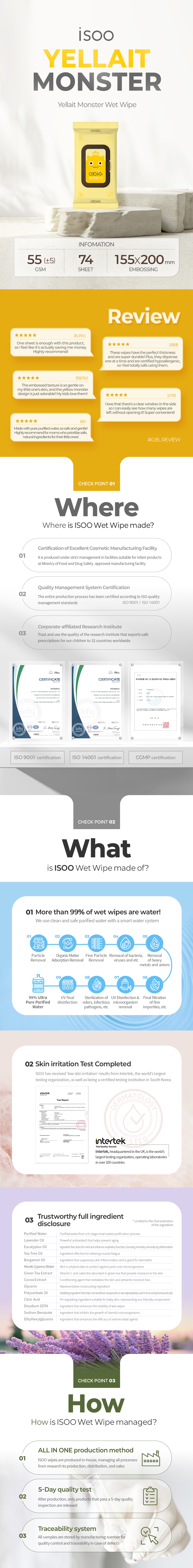 ISOO Yellait Monster Wet Wipes have undergone thorough skin irritation tests conducted by a reputable domestic certified testing institution designated by the Ministry of Food and Drug Safety, guaranteeing their safety for daily use on sensitive skin.