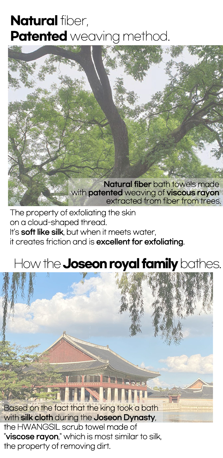 Hwangsil scrub towel is natural fiber towel made from viscose rayon made by extracting fiber from tree by a patented weaving method.