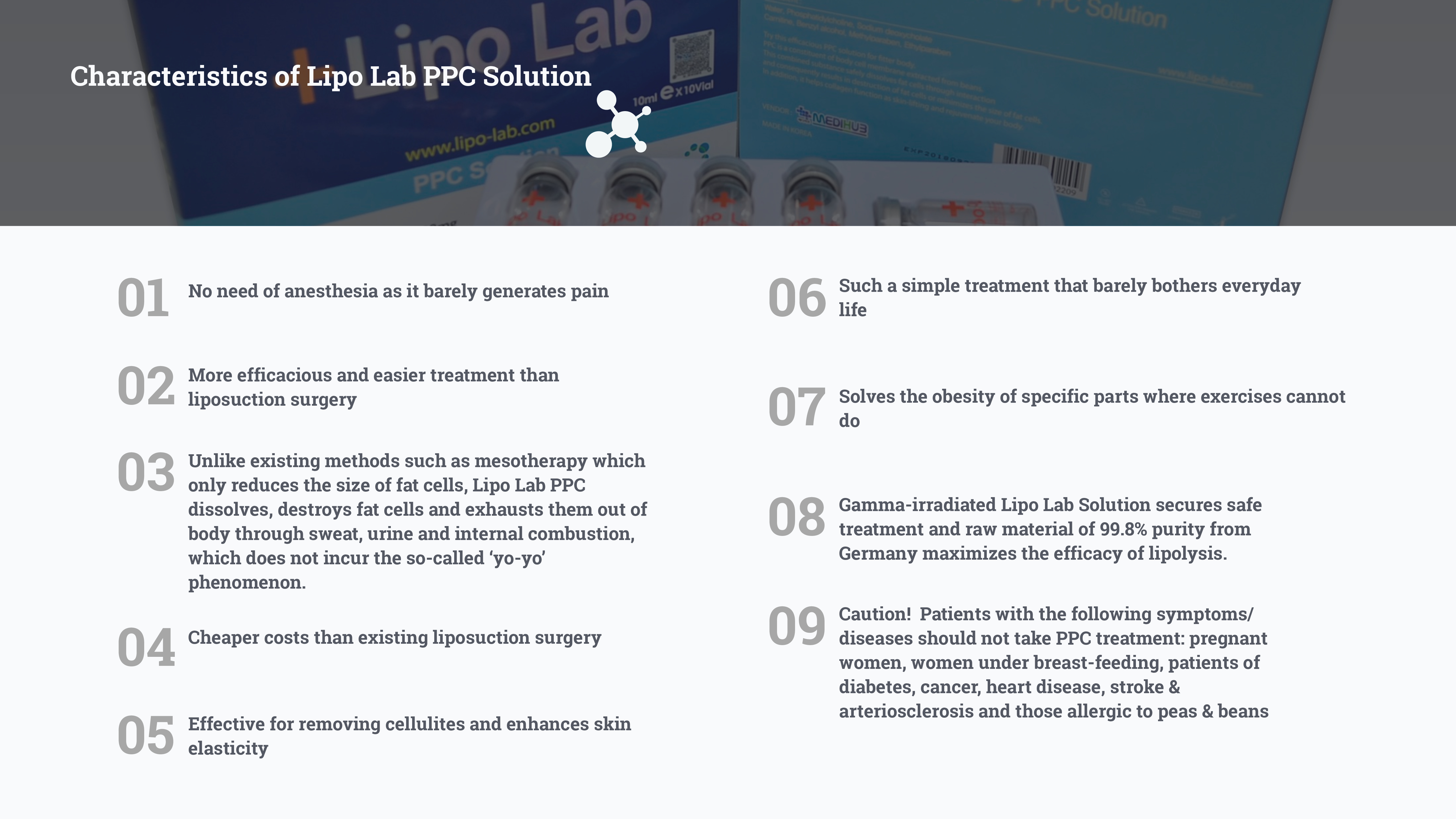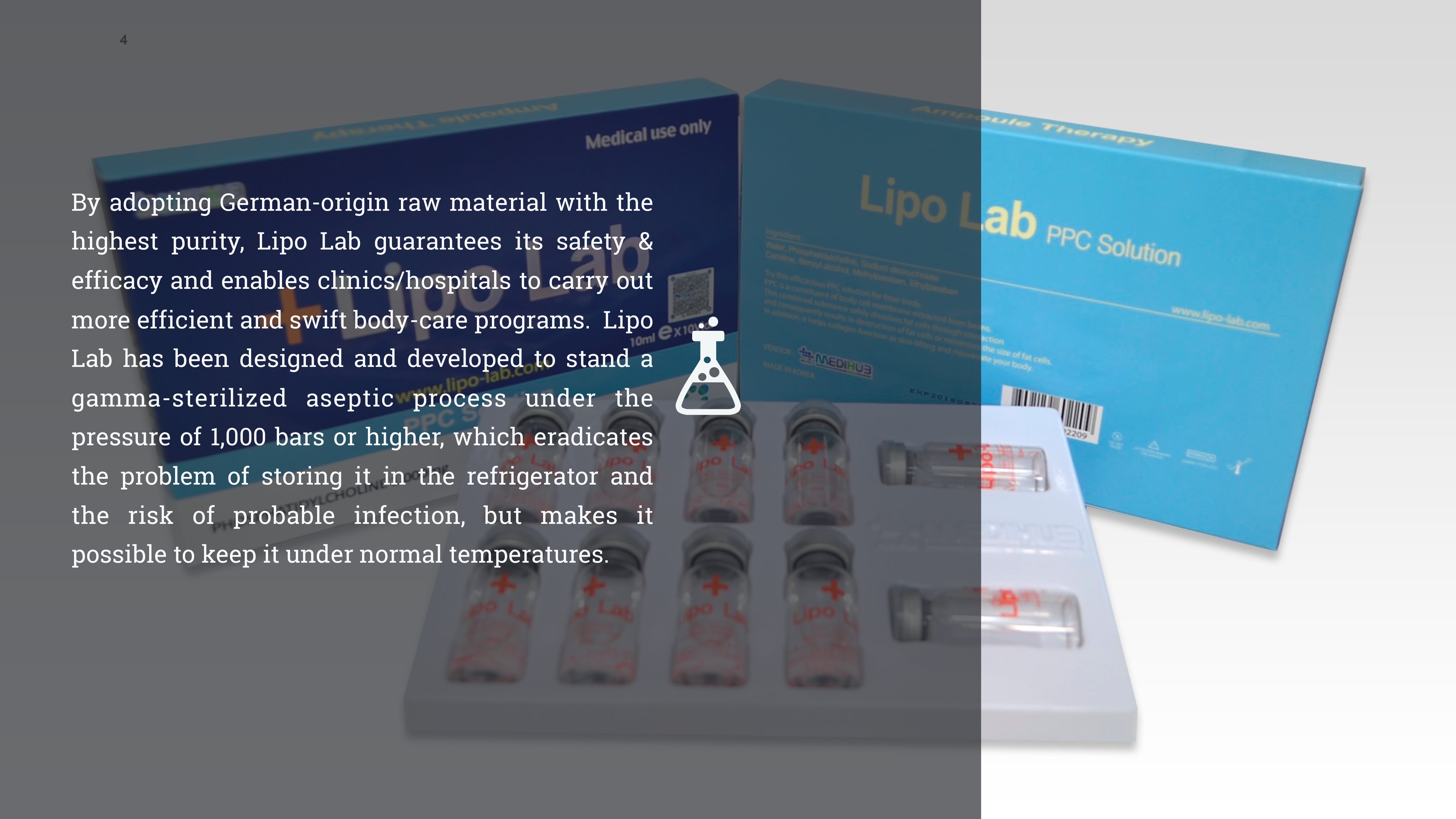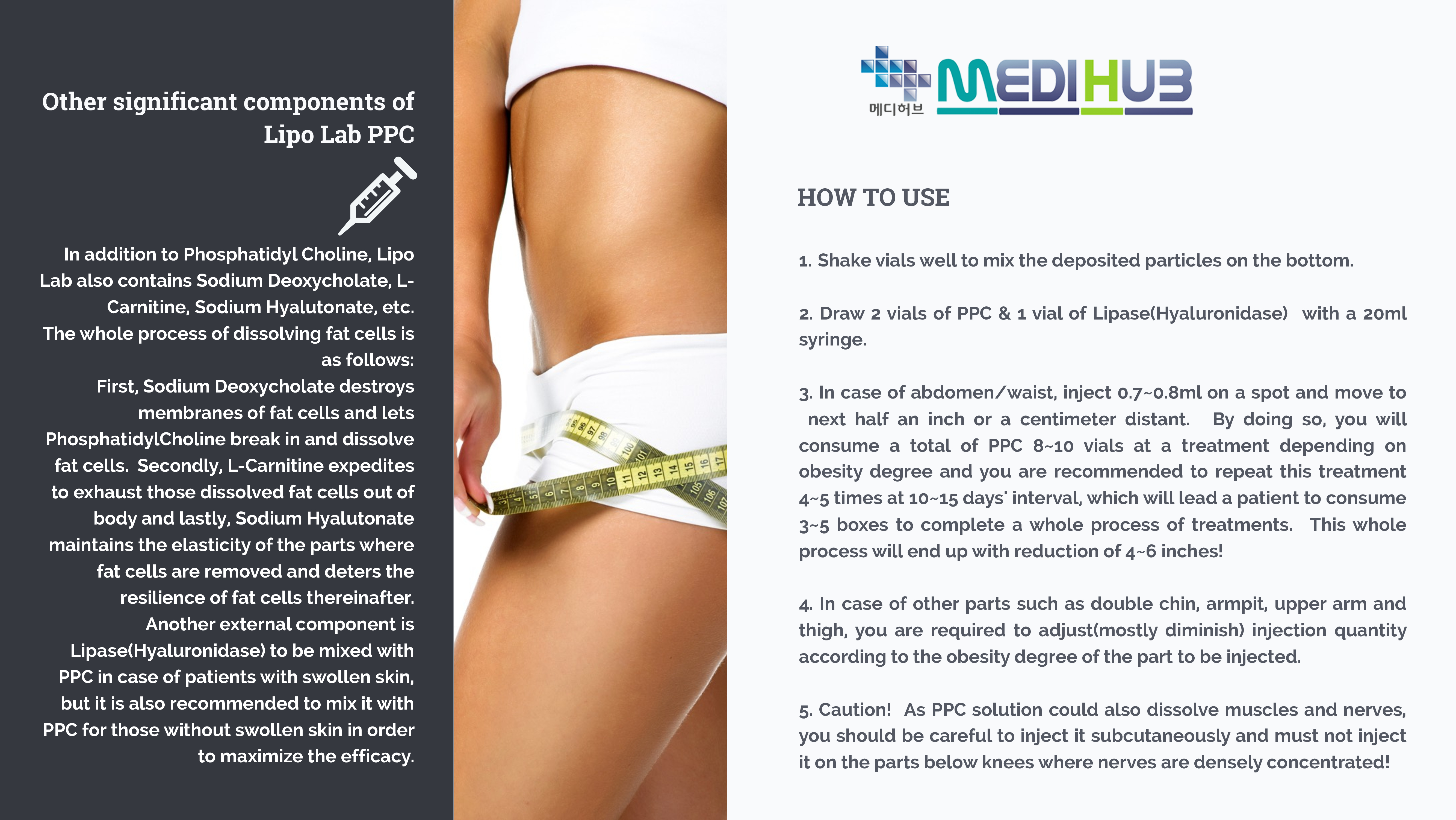 Lipo PPC is a highly effective fat dissolving product that provides fast subcutaneous fat removal with natural and health-friendly methods. It is one of the safest options available for treating obesity. Lipo works by speeding up metabolism and melting the fat tissues. The product is made using high-quality raw materials from Germany, known for their safety, effectiveness, and purity (99.8%).