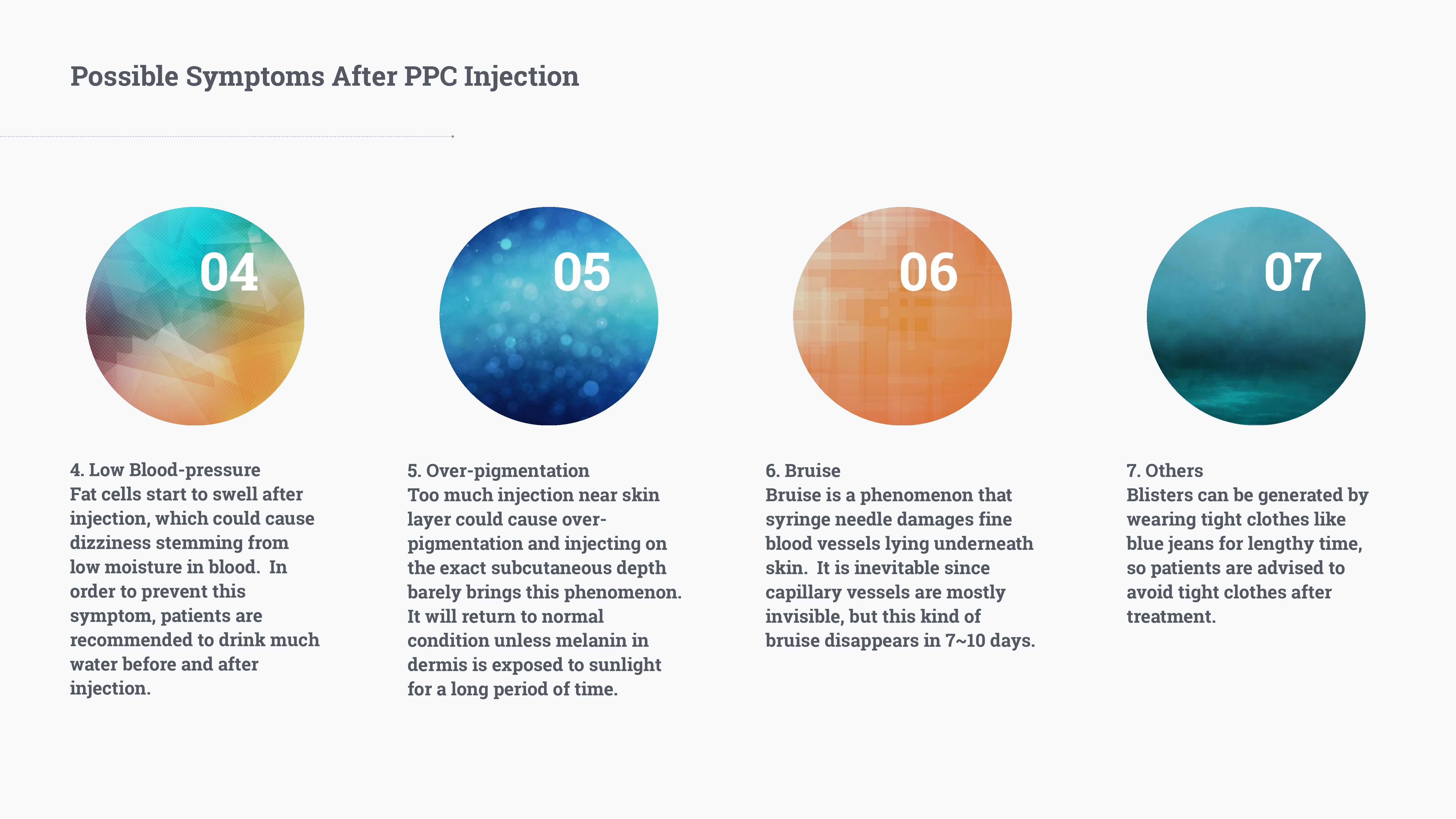 • Inject 0.2~0.4cc per injection directly into the subcutaneous tissue.• Space injection sites 1 centimeter (1/2 inch) apart.• It is common to use a total of 2~5 vials per treatment in this area, depending on the thickness of the fat layer.• Depending on the individual desires, repeat this treatment 2~3 times at a 4 week interval.