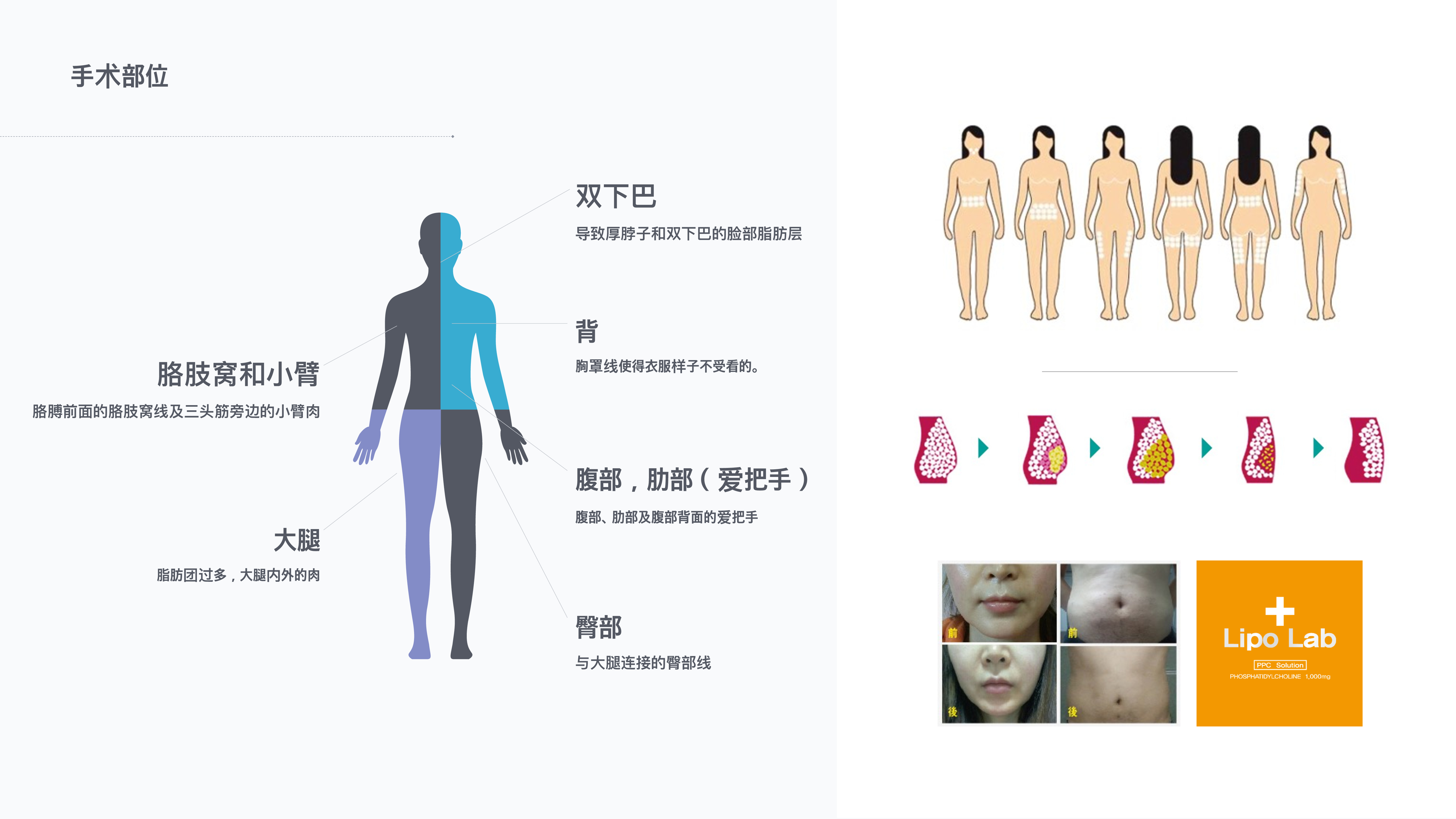 • Double chin• Armfit. forearm• Back• Abdominal region, ribs (love handles)• Hips• Thighs