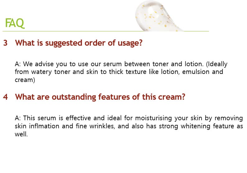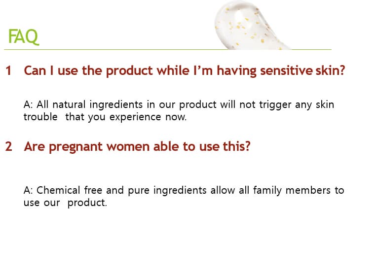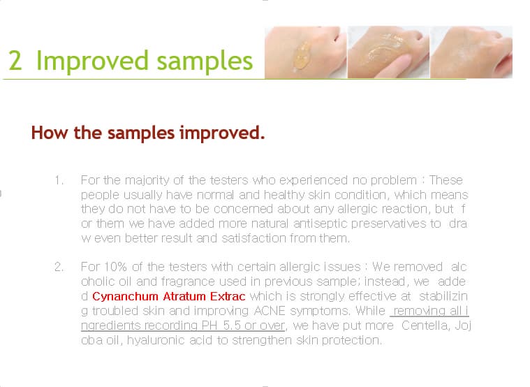 2. For 10% of the testers with certain allergic issues : We removed alcoholic oil and fragrance used in previous sample; instead, we added CynanchumAtratumExtrac which is strongly effective at stabilizing troubled skin and improving ACNE symptoms. While removing all ingredients recording PH 5.5 or over, we have put more Centella, Jojoba oil, hyaluronic acid to strengthen skinprotection.