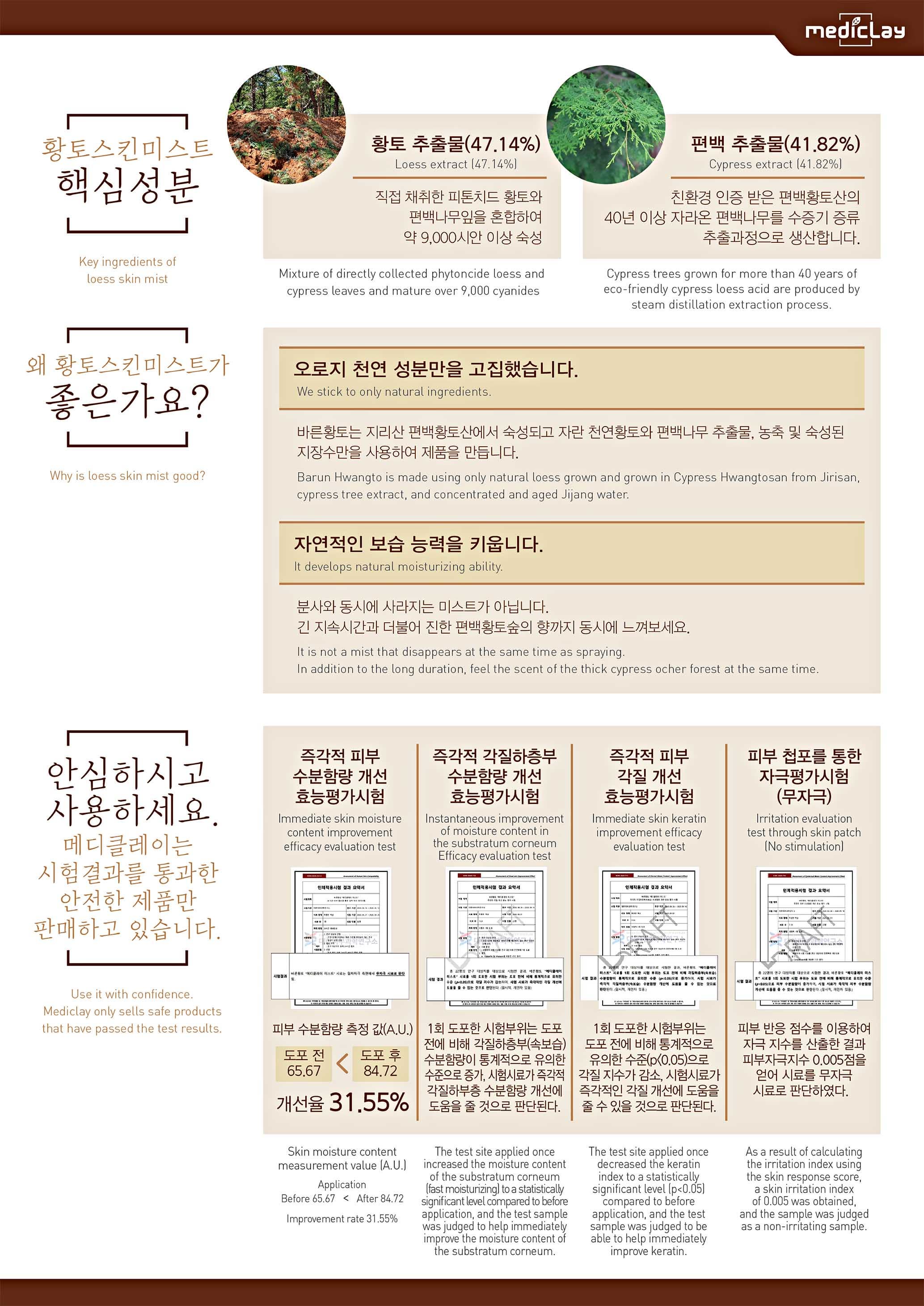 MEDICLAY only uses the loess extract and cypress extract manufactured with the ingredients obrained directly at the cypress loess mountain certified as pesticides-free by the Ministry of Agriculture, Food and Rural Affairs and owned by MEDICLAY.