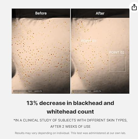 Apply the serum overnight on cleansed skin. Use consistently for two weeks for long-lasting pore refining effects. Results include a 10.8% reduction in pore appearance after one day of use, along with improvements in blackheads/whiteheads, sebum production, and skin bumpiness. Suitable for all skin types.