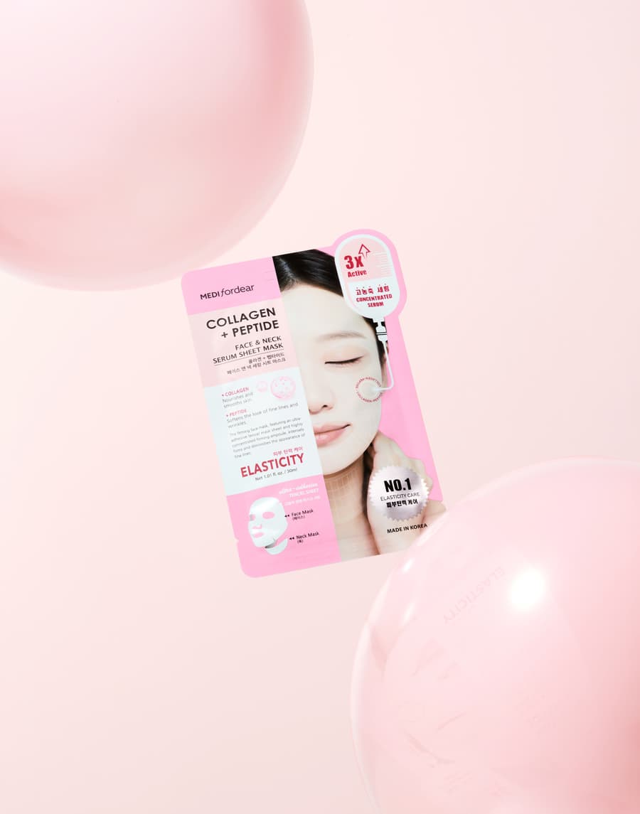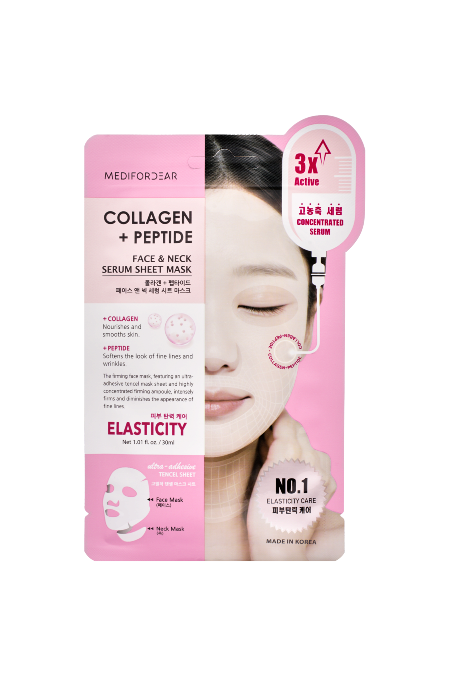 MEDIFORDEAR Face & Neck Mask with Collagen and Peptide is a firming and moisturizing treatment designed to support skin elasticity in both the face and neck area. Collagen helps improve skin suppleness, while peptides support the skin’s natural structure and firmness. The mask fits closely to the skin, allowing the essence to absorb effectively. After use, the skin feels smoother, firmer, and deeply hydrated, with a more youthful-looking appearance.