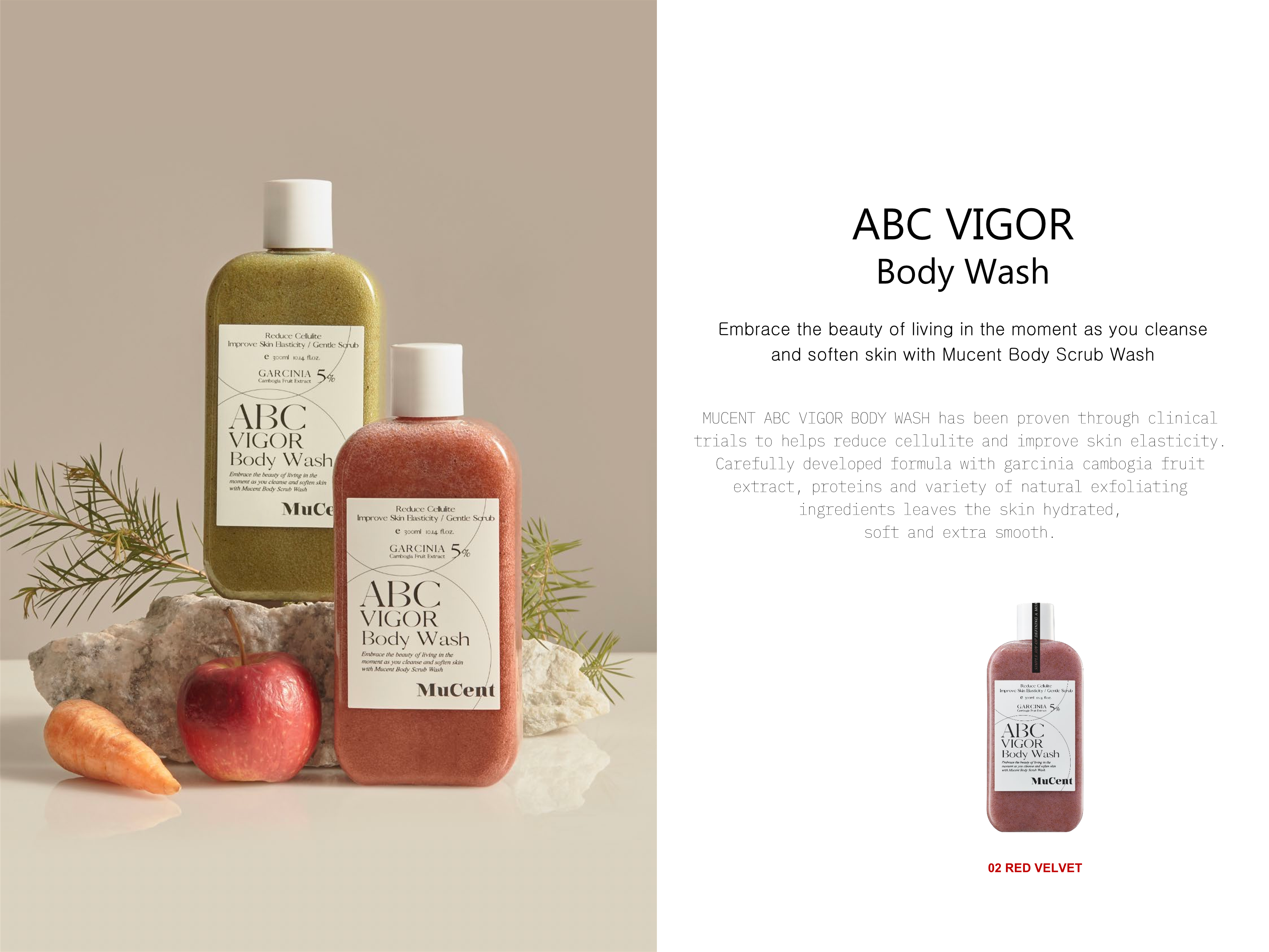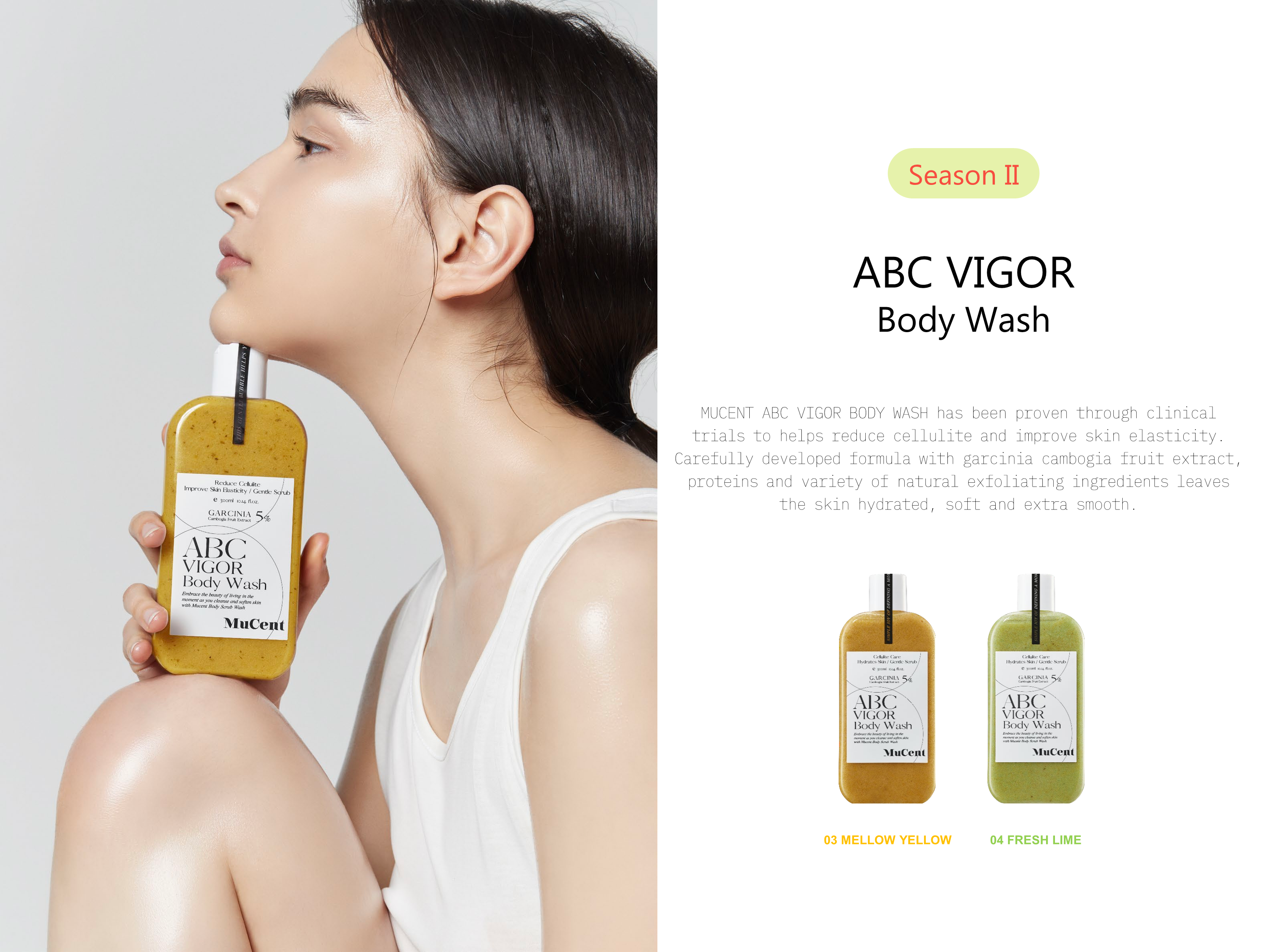 MUCENT ABC VIGOR BODY WASH has been proven through clinical trials to helps reduce cellulite and improve skin elasticity.