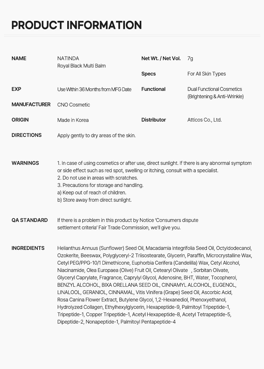 A highly concentrated, highly nutritious balm that lifts skin firmlyWrinkle and Whitening Functional Cosmetics #Wrinkle, Whitening Functionality#High Collagen Content#Natural Oil The desire to turn back the clock on our skin age is as strong as the passage of time. Can it really be reversed? Wrinkle care, Moisturizing Care, Brightening,Whitening, Elasticity Care, Skin GlowWhitening, Elasticity Care, Skin Glow 6 in 1 Multi-care balm Wrinkle care, Moisturizing Care, BrighteningWhitening, Elasticity Care, Skin GlowAll these functions are packed into one multi-balm. Cheeks / forehead / eyes / neck / lips To people like below are recommended. People who are concerned about dull and dry skinThose who are concerned about loss of skin elasticityThose who want to soothe rough skinThose who want to improve dull skin toneThose who look older with deep wrinklesThose who want a non-sticky product Collapsing moisture barrierIncrease your moisture retention! Skin moisture density weakened by dryness,Natural moisturizing factors fill the moisture density from within the skinand build a dense moisture barrier that does not easily collapseand moisturize skin tired from dryness. Highly Nutritious + Highly ConcentratedContains natural ingredients such as rosehip extract The beginning of advanced moisturizing care that protects the skin barrier The basics of skin care definitely start with moisturizing.Experience moisturizing care that rises from the inside out A measure of healthy skinHigh in collagen It contains a significant amount of collagen, which is great for effectively enhancing skin elasticity and reducing wrinkles. Bright skin as if the lights were onWhitening, Brightening It contains rosehip extract for sensitive skin! It has a soothing effect on sensitive skin due to stress and tension, with 17 times more vitamin C than lemon and 20 times more vitamin A than tomato, promoting the skins self-regeneration ability and anti-aging. Why?Why choose rosehip extract? It has a soothing effect on sensitive skin due to stress and tension, with 17 times more vitamin C than lemon and 20 times more vitamin A than tomato, promoting the skins self-regeneration ability and anti-aging. Manufactured with good raw materialsReliable Certified Facility - Natinda’s Promise -Natinda is committed to providing safer cosmetics Through strict management supervision and regular inspections.For the health of your skin, Natinda will continue to make even greater efforts in the future.