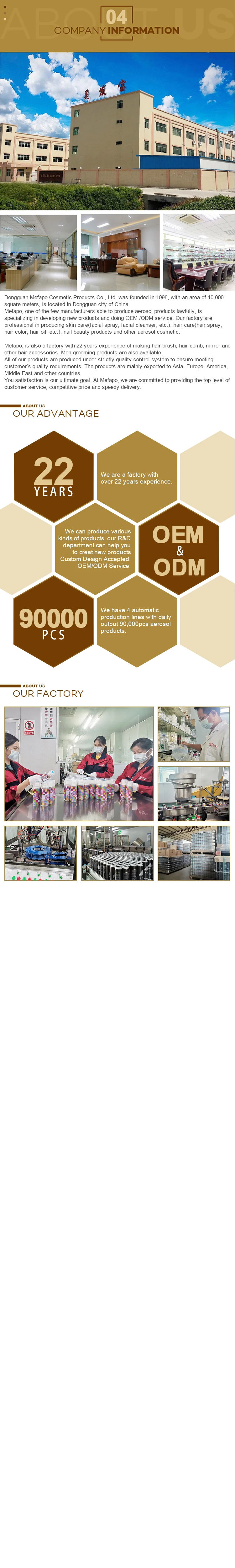 Dongguan Mefapo cosmetic co,.ltd located in famous ancient town Shipai ,Guangdong province with more than 20000sq meters and 200 workers ,we are proffesional in haircare and hairdressing products for more than 22 years,welcome to our factory for visiting