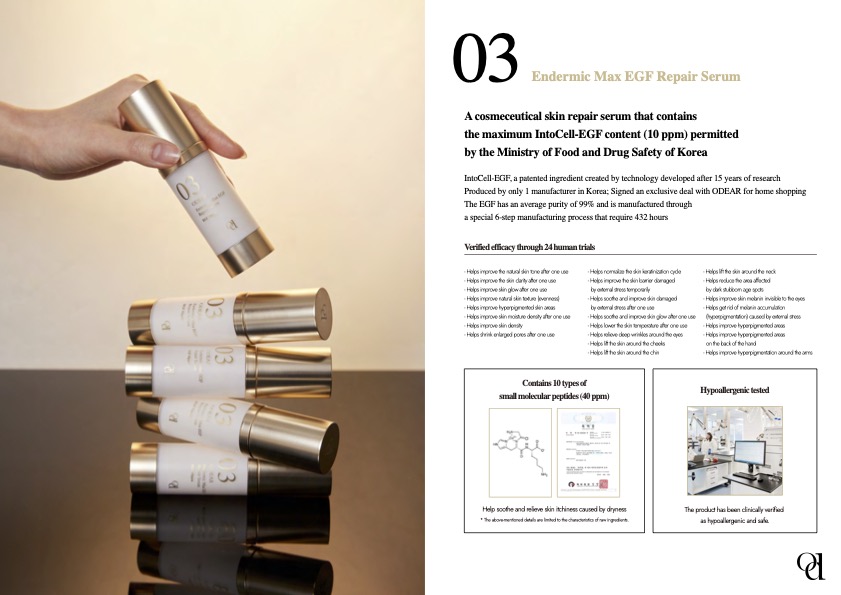 EGF Contains epidermal growth factor (EGF), a protein, and penetrates powerful nutrients to the skin Hydrolyzed Collagen Extract Improves skin moisturization and hydration.