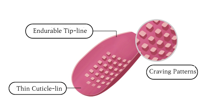 • • The adhesive surface is dot patterned to increase the adhesive area between the tip and the nail by 30% wider and improve nail volume.