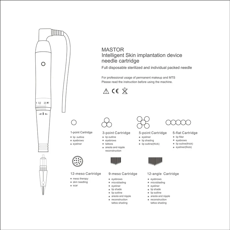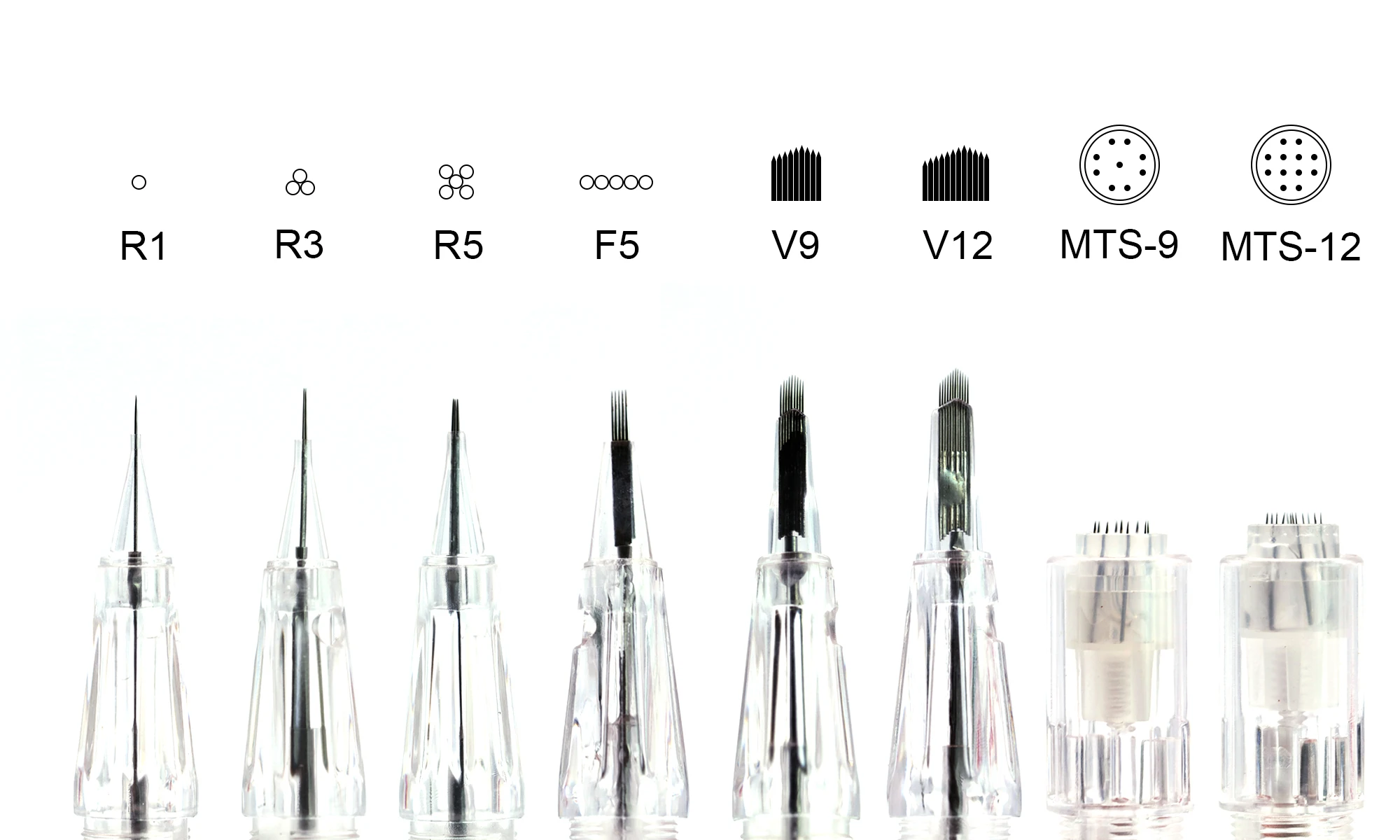 Cartridge needle R1: Eyebrow , Lip line , Eyeliner R3: Shadow Eyebrow,Eyeliner R5: Shadow Eyebrow,Lip plane F5: Shadow Eyebrow,Lip plane V9:Eyebrow, Eyeliner ,Lip V12:Eyebrow, Eyeliner ,Lip Meso-12/9/36/42: Microneedling skin care