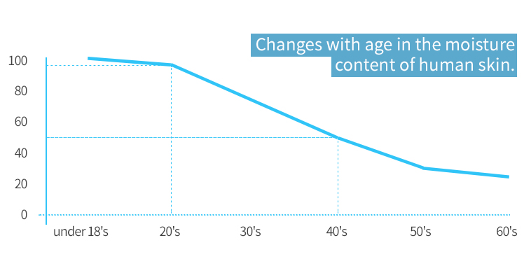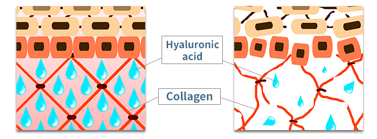 | [ Young, healthy skin moisturized with HA ] | [ Aged, damaged skin lacking HA ] |